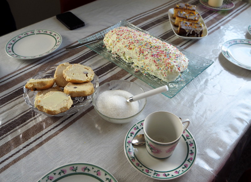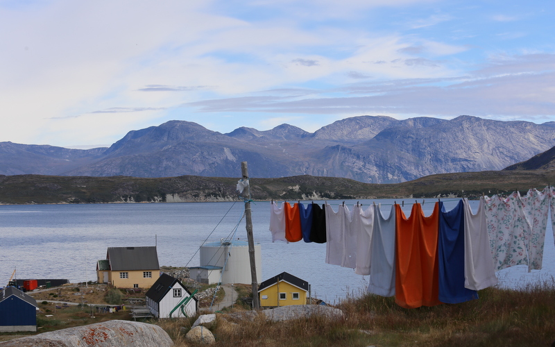 Kapisillitin kylä tuo mieleeni Utön. Ehkä siksi, että täälläkin on rannassa pieni kauppa. Mäellä on joukko erivärisiä taloja sikin sokin ja läheisellä pienellä luodolla katos, jossa kuivataan kalaa. Seuraavalla niemelläkin on pieniä taloja: ne ovat kuulemma nuukkilaisten mökkejä. Nousemme jyrkkää mäkeä ylös ja astumme sisään siniseen taloon, jossa meille on katettu kahvipöytä. Grönlantilaisittain kaffemilk. Aloitamme varovasti voileivillä vaikka pieni tyttö selvästikin odottaa jo kärsimättömästi, että hänkin saisi täytekakkua ja lopulta isä heltyy ja antaa hänelle ensimmäisen palan kakusta. Keskustelu käy hiukan vaivalloisesti, sillä kapteenimme joutuu kääntämään grönlannista englantiin ja takaisin. Jotain perhe kuitenkin tietää Suomestakin, serkku on päätynyt naimisiin Kautokeinoon ja saamme katsoa kuvaa hänestä suomalaisessa lapinpuvussa. Ja kuvia perheestä kansallispuvuissa isän 40-vuotispäivänä.