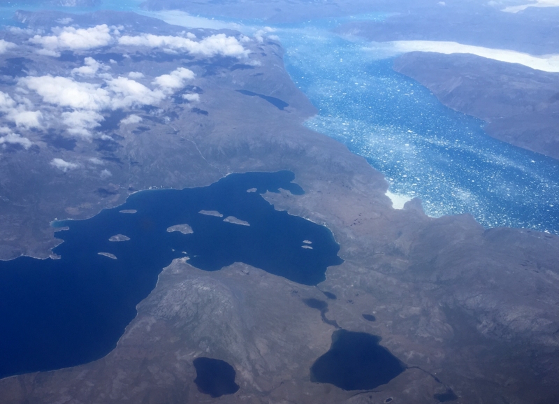 Seuraavana päivänä lennollamme Nuukista Reykjavikiin satumme näkemään vielä saman vuonon pohjukan ja erotamme jopa muutaman kylän taloista. Lentokoneen ikkunan läpi otettuun kuvaan asti ne eivät tallentuneet, mutta jäävuono, jota nousimme kallion laelle katsomaan näkyy tässä kuvassa hyvin. Kylä on tuossa alalaidassa olevassa terävässä niemessä.