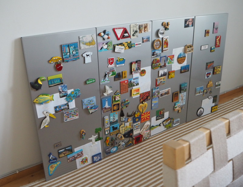 Sapattivapaani loppupuolella ideoin jossain vaiheessa, että voisin yrittää laittaa kaikki keräämämme magneetit jotenkin esille, vaikka maailmankartan muotoon. Jääkaapin, isonkaan, oveen ne eivät enää ole mahtuneet vuosiin – paitsi uusimmat sen aikaa, että tuoreemman matkan uudemmat taas korvaavat edelliset.