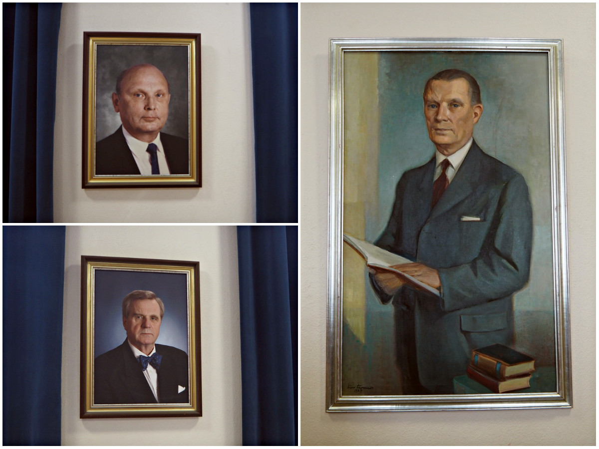 Seinillä meitä katsoivat entiset rehtorit, Aarne Toivonen (vasemmalla ylhäällä), Aulis Jantunen ja Einari Joutsamo (oikealla).