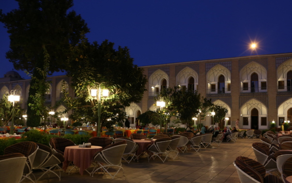 Kolmantena Isfahanin iltana halusimme vaihteeksi länsimaista ruokaa, vaikka monet nauttimistamme persialaisistakin aterioista ovat olleet oikein hyviä, esimerkiksi kana pähkinägranaattiomenakastikkeessa Shahrzad-ravintolassa, jota Lonely Planet väittää Isfahanin parhaaksi. Ja halusimme nauttia sen Abbasi-hotellin puutarhassa.