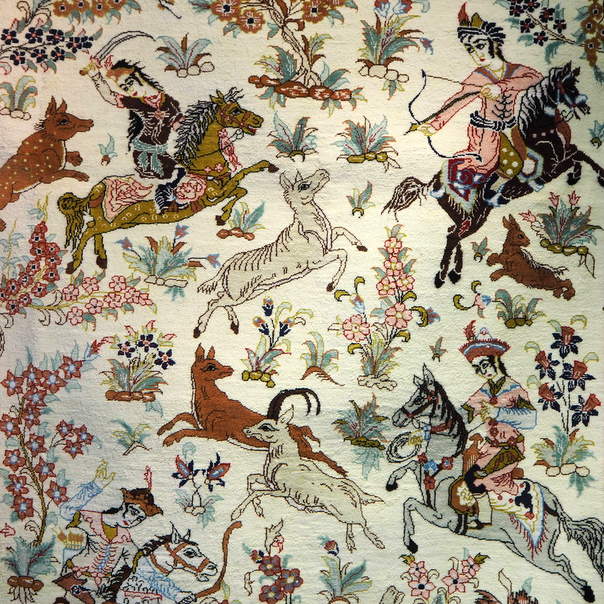 Annamme kauppiaan vielä hetken ymmärtää, että voisimme olla kiinnostuneita joistain vaaleasta matosta ja hetkessä eteemme leväytetään kolmen miehen voimin useita vaaleasävyisiä mattoja mainitsemassamme koossa (140 x 200 cm). Kysyn yhden hintaa: 2200 euroa. Kaupan seinällä on myös vaaleasävyinen perinteinen metsästysaiheinen kokosilkkinen matto: sen saisi hintaan 9000 euroa. Tosin kauppias melkein kieltäytyy myymästä sitä meille, sillä kuvio, vaikka se nyt viehättäisikin meitä, on liian levoton, silmämme tulisivat väsymään siinä ja lisäksi kuvio on vain yhteen suuntaan. Ok, ei siis tätä. Eikä kyllä sitä toistakaan, vaikka poikkeuksellisesti Iranissa, voisimme maksaa maton luottokortilla Dubaissa sijaitsevan sisarliikkeen ansiosta. Poistumme liikkeestä muunnellen hiukan totuutta sanoessamme, että jäämme miettimään asiaa.