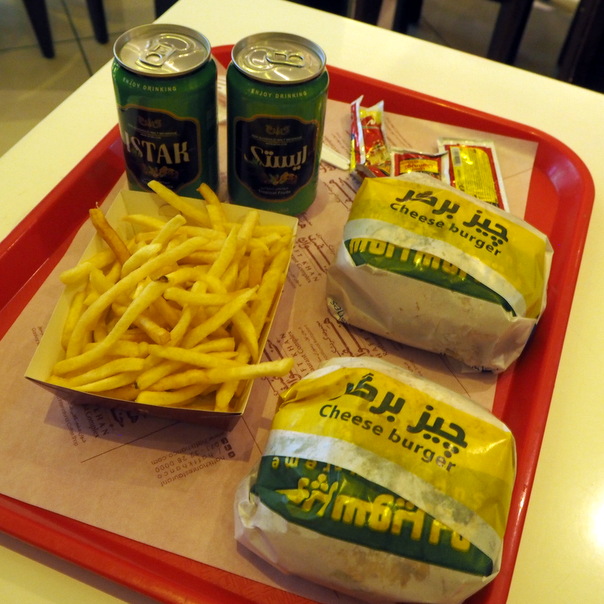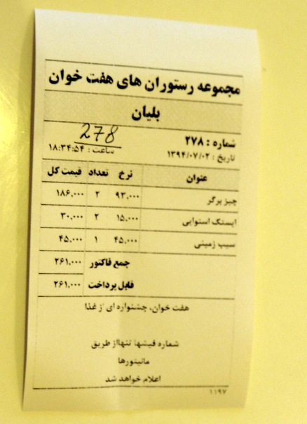 Kävelimme hiukan matkaa takaisin kaupunkiin päin ruokapaikkaa etsien ja päädyimme Tripadvisorin lämpimästi suositteleman Haft Khan -ravintolakompleksin Fast Food -kerrokseen hampurilaisille ja hedelmäolueille. Ruokalistat olivat sekä farsiksi että englanniksi, mutta lisäksi nuori nainen, jonkinlainen hovimestari, joka puhui erinomaista englantia, opasti meitä tilausprosessin läpi ja maksamisessa. Tomat ja rialit meinasivat taas mennä hiukan sekaisin, 26 000 tomaa maksettaessa lompakosta pitää kaivaa 260 000 rialia!