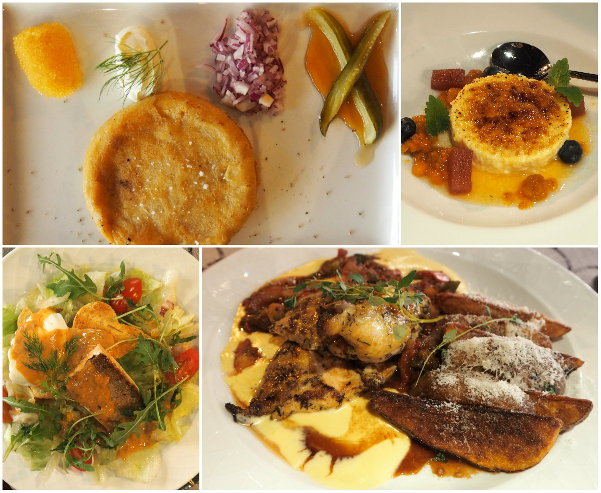 Pääruokina kokeilimme lohibriossia uppomunalla ja maissikanaa maalaislohkoperunoilla ja Provencen kasvispaistosta. Lohi ei säväyttänyt, mutta maissikana ja erityisesti parmesanilla ryyditetyt maalaislohkoperunat olivat hyviä.