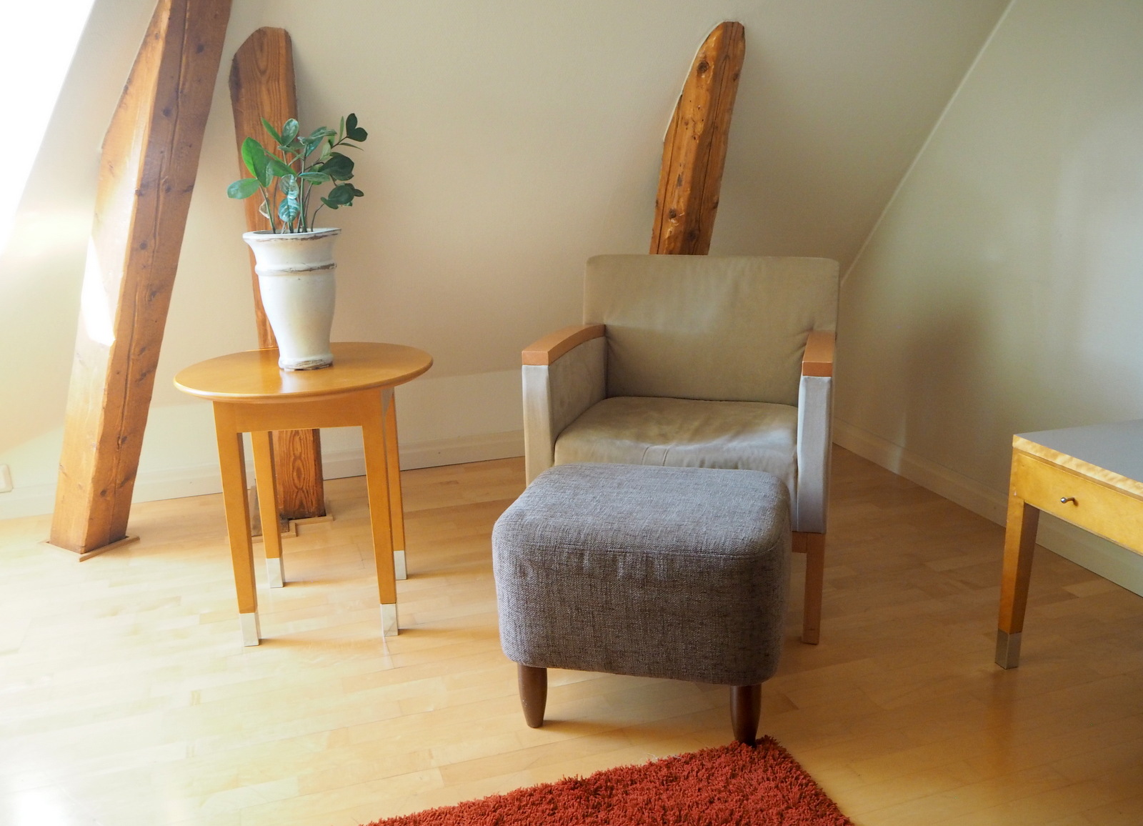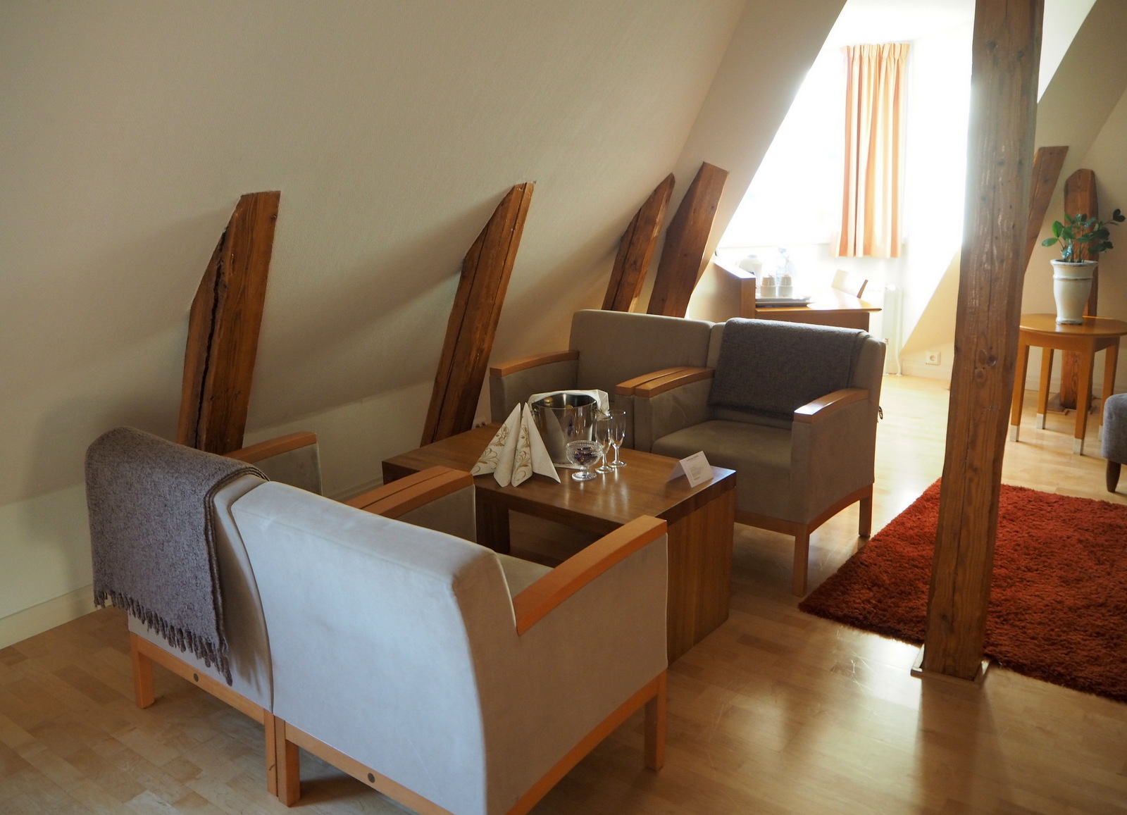Mutta takaisin huoneeseemme, tällä kertaa sitä ei nimittäin voi kuitata sanomalla, että huone kuin huone, yöpyihän siellä. Tämä kulmahuone (huone 764) tuntui oikeasti kodilta. Korkealla lähitalojen kattojen yllä, esiin jätettyjen parrujen ja vinon katon alta löytyi, tietysti, sänky, mutta myös oleskeluryhmä ja omassa nurkkauksessaan myös työpöytä. Tilavassa kylpyhuoneessa oli täysimittainen amme, sekin kuin lapsuudenkodissani!