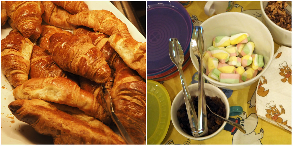 Aamiainen tarjoillaan kahdessa paikassa, sekä Fransmannissa että toisen kerroksen ravintolassa ja kokeilimme aamulla vaihtelun vuoksi tuota jälkimmäistä. Aamiainen ei hätkähdyttänyt: ei niin, että olisimme jääneet nälkäiseksi tai mikään tuoteryhmä olisi erityisesti puuttunut, mutta ei tarjolla ollut mitään erityisen ekstraakaan. Tekniikasta kiinnostuneina pysähdyimme toki hetkeksi mehuautomaatin kosketusnäytön äärelle. Ja makean ystävänä napsin lasten pöydästä muutaman vaahtokarkin! Ja ei niissä lämpimissä croissanteissakaan mitään vikaa ollut.