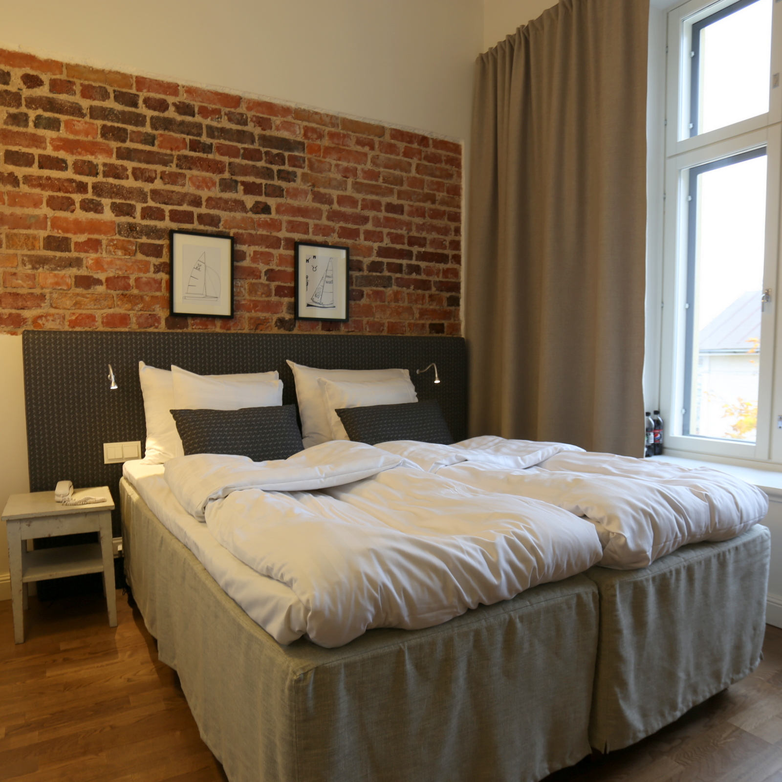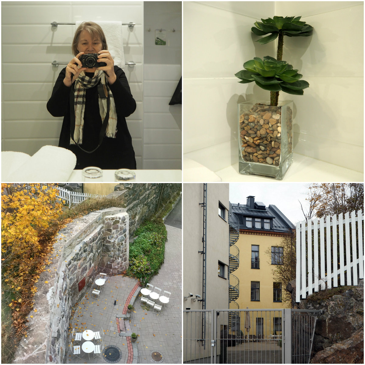 Huoneemme 3. kerroksessa ei ollut iso, mutta emmepä me huoneessa olleet ajatelleet viikonloppuamme Hangossa viettääkään, joten kyllä sinne mahtui. Kylpyhuone oli uudenkiiltävä ja valoisa ja näköala sisäpihalle syksyisen värikäs. Jos olisimme viipyneet pitempään (tai helteisenä kesäviikonloppuna), olisimme kaivanneet pientä jääkaappia, mutta nyt muutaman juotavapullon sai pidettyä kylmänä ikkunoiden välissäkin.