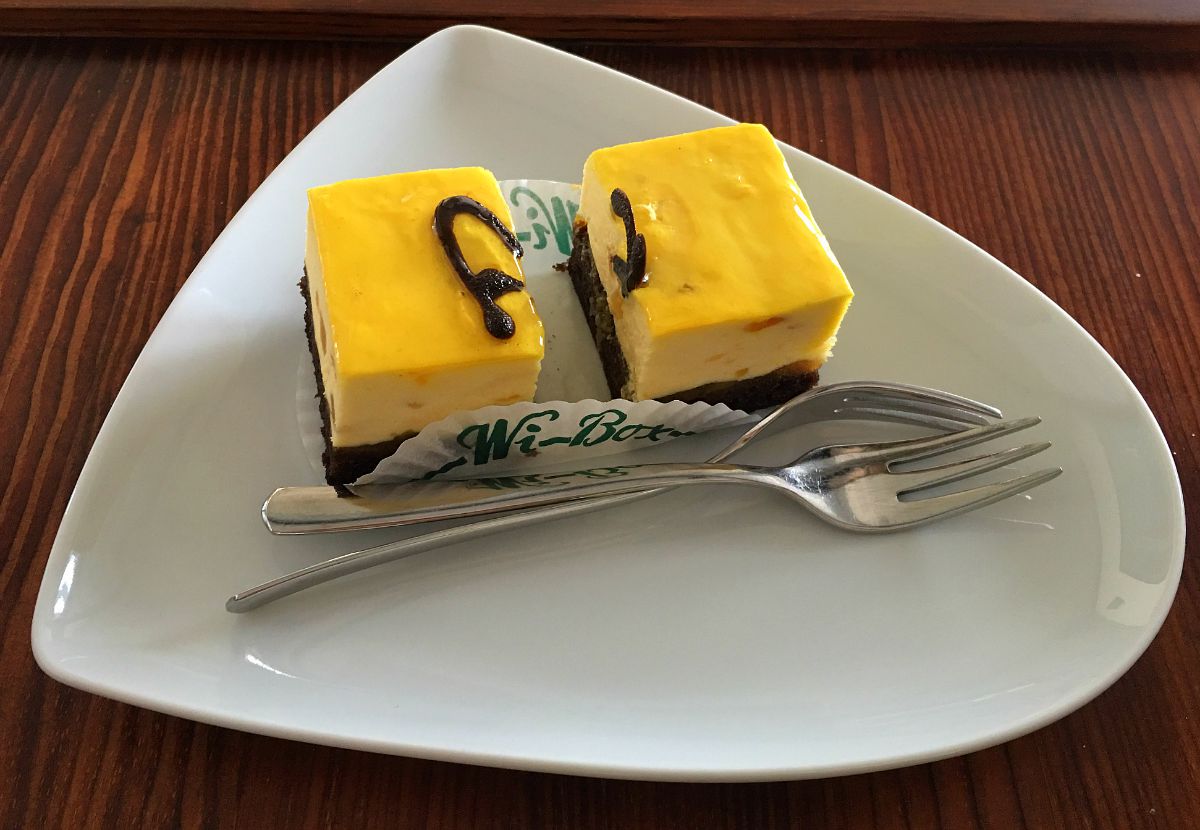 Hotellin yhteydessä on korttelin merenpuoleisessa kulmassa Cafe Regatta, jossa nautimme heti saavuttuamme kevyen lounaan – ja jälkiruuaksi Regatta-leivoksen puoliksi. Kahvilan henkilökohta päätti ilmeisesti meidät nähtyään, että riitahan tuosta leivoksesta tulee ja puolitti sen meille valmiiksi! Jos meillä olisi ollut koira matkassa, niin sen välipalan olisi tarjonnut Nelson!