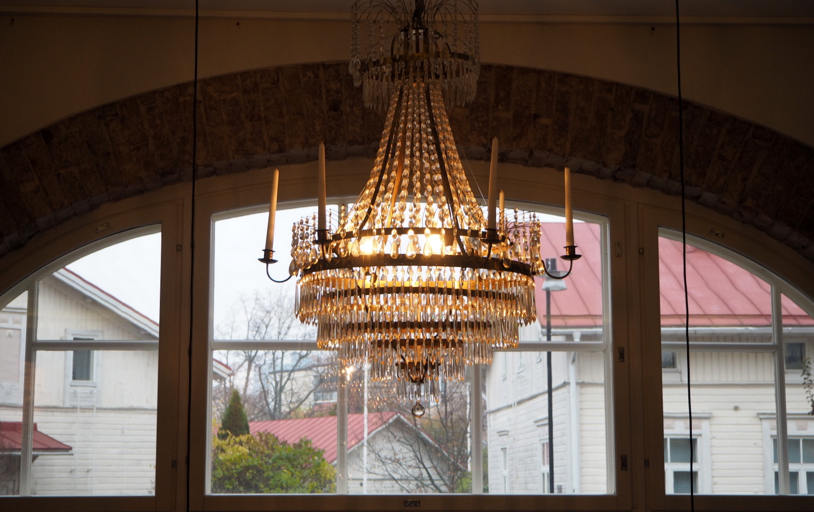 Ja miljöö sitten, kaariholveineen ja kristallikruunuineen ja syksyisine kukkakimppuineen. Vaikka syksyinen sää olisi ollut ankea (mitä se tällä kertaa ei ollut), niin täällä päivä olisi alkanut iloisissa merkeissä! Kesällä aamiaisen olisi voinut nauttia sisäpihallakin.