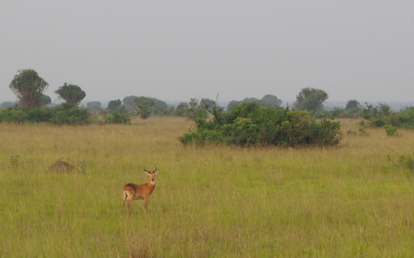 Puiston portilla nostamme jo auton katon ja pysähtelemme ensimmäisten gobien kohdalla. Ugandassa “perusantilooppi” ei ole impala vaan kobi.