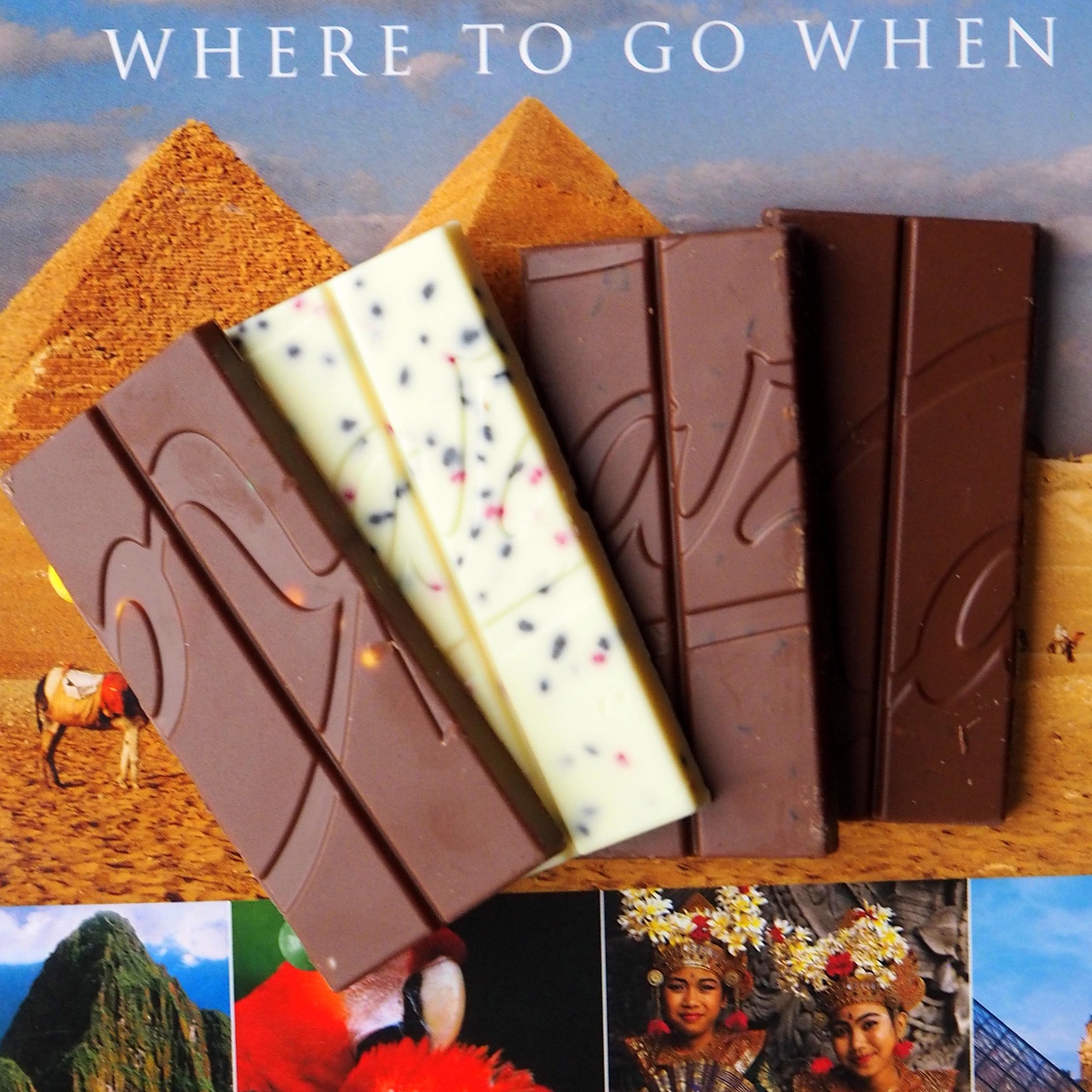 Minkä Sinä valitset? Tässä vielä koko setti matkakirjan Where To Go When kannelle ladottuna. Me olemme aina uskoneet siihen, että jos vain mahdollista, pitää valita kullekin kohteelle oikea ajankohta, ettei päätyisi keskelle sadekautta tai yli 40 asteen helteisiin, joten matkojen suunnitteluun pitää aina välillä paneutua ja toki näiden suklaiden voimalla sitä jaksaa tehdä entistä paremmin :-)