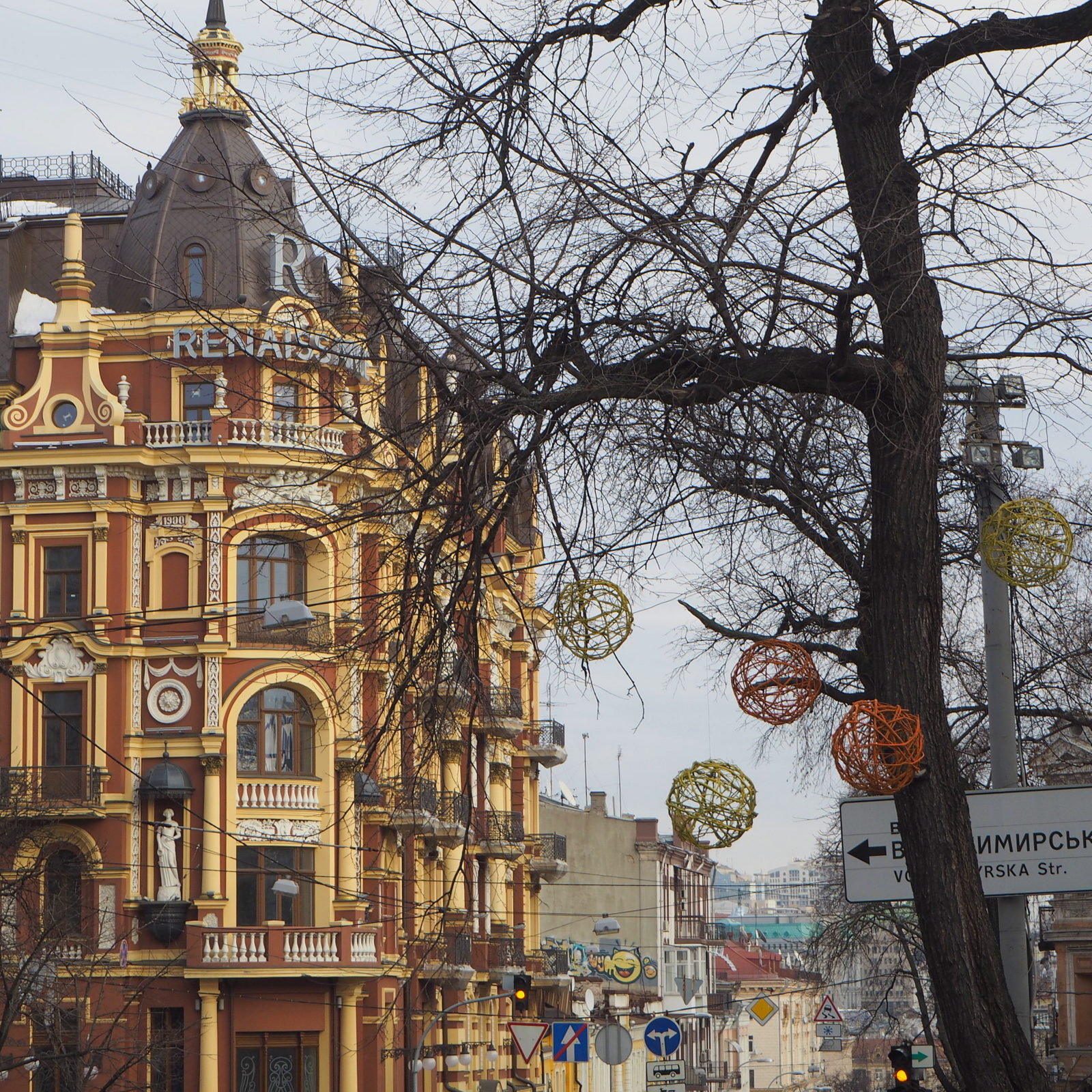 Kevyempää puolta jo tuossa vaiheessa lauantai-iltapäiväämme Kiovassa edustivat Panteleimonkin kissa ja Renaissance -hotellin läheisellä kadulla puissa olleet koristeet, niin pallot kuin koristelinnutkin.