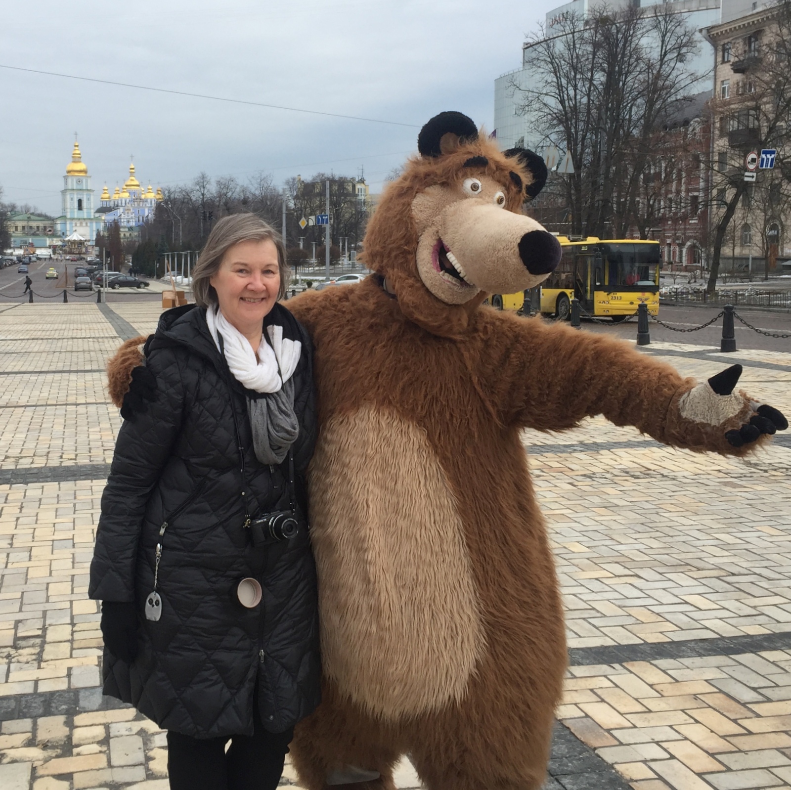 Sofia-aukiolla törmäsimme ensimmäisen kerran Kiovassa ilmeisen yleiseen tapaan yrittää saada osansa turistien rahoista, eli tapasimme karhun, joka halusi kanssamme kuvaan – ja sitten tietysti pienen korvauksen kuvasta. Kyllähän me arvasimme, että rahaahan tuo karhu haluaa, mutta tavallaan oli oikeastaan kiva nähdä, että ei Kiova niin turisteista tyhjä kaupunki, ettei näiden muutamien karhujen, seeprojen ja muiden eläinten kannattaisi viettää lauantaita Sofia- tai Maidan-aukiolla.