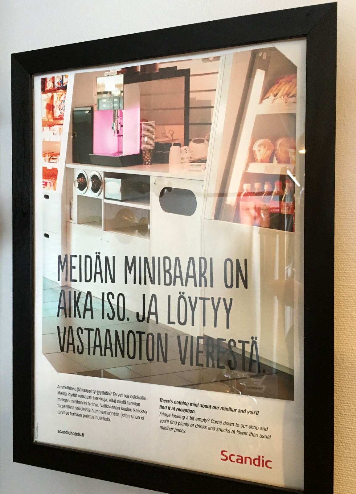 Iltapalaa emme teatterin jälkeen enää kaivanneet, mutta juotavaa ostimme alakerran “minibaarista”. Samaiseen konseptiin, hotellin ala-aulassa sijaitsevaan pieneen kauppaan, olemme aikaisemmin törmänneet Scandic -hotellissa Turussa, joten kyse taitaa olla Scandic-hotellien vakiovarustuksesta, fiksusta sellaisesta. Valikoima on kuitenkin paljon isompi kuin perusminibaarin ja hinnat paljon lähempänä kaupan kuin minibaarin hintoja. Monessa kohtaa maailmalla ainakin ensimmäisenä iltana ilahtuisimme tällaisesta!