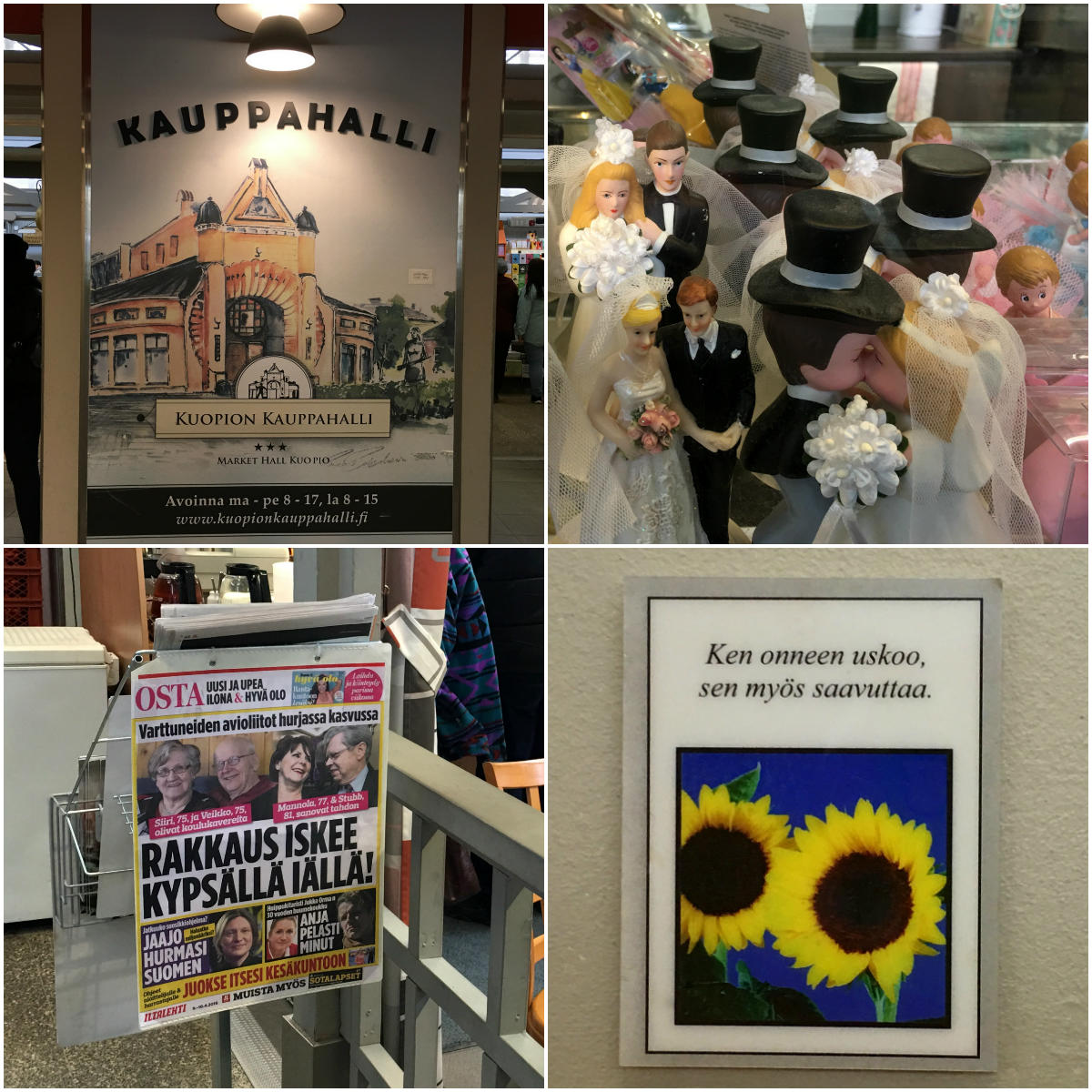Kuopion torista ja etenkin tietysti Hanna Partasen kalakukkokojusta meillä olikin mielikuva vuosikymmenien takaa, kun taannoin vietimme muutaman kesäisen päivän Rauhalahdessa. Tällä kertaa tutustuimme myös Kuopion kauppahalliin, vaikka emme hetimmiten ruuan tarpeessa olleetkaan. Mutta olihan siellä silmänruokaa – ja selvästikin rakkautta ilmassa!