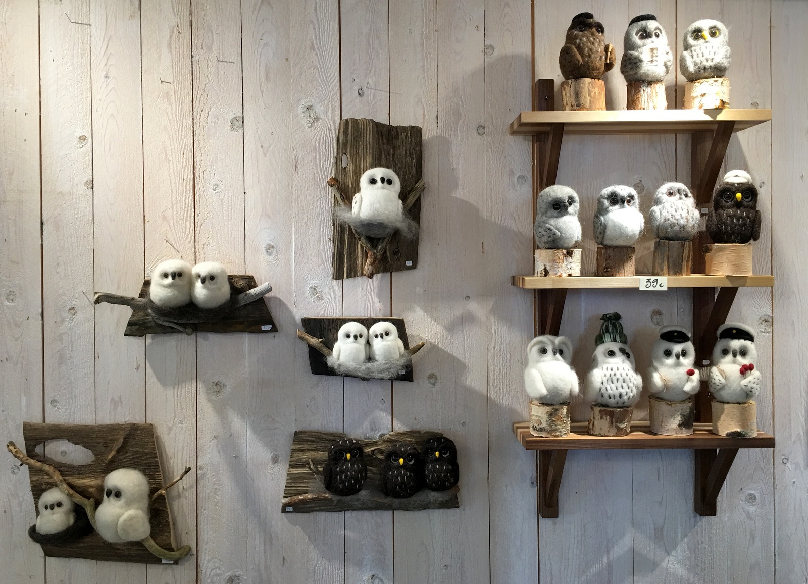 Käsityöliikkeessä on myytävänä lankoja, valmiita neuleita ja huovutustöitä.