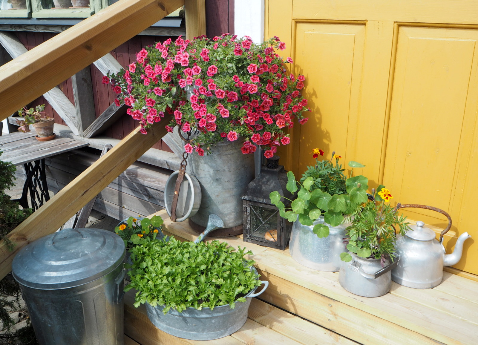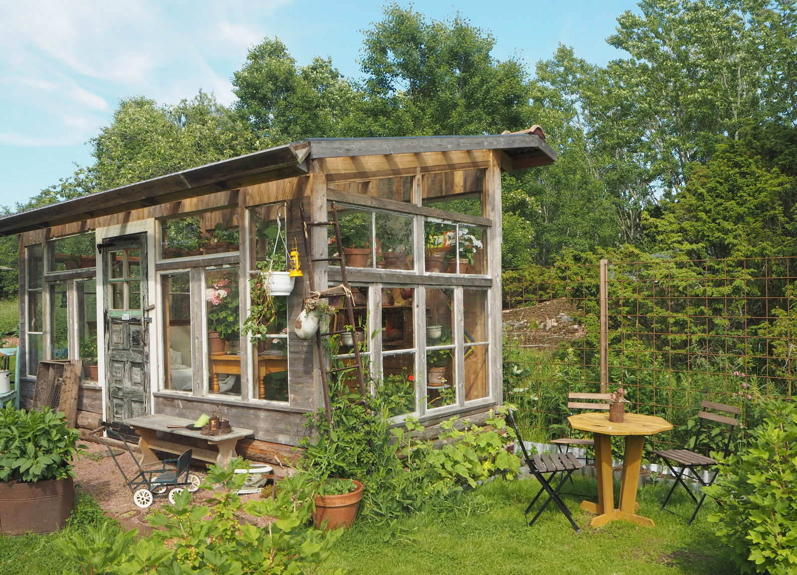 Puutarhasta löytyy monen moista istumapaikkaa valittavaksi, puiden alta, kasvihuoneen kulmalta tai keinutuolista puiden siimeksestä. Ja löytyy se istumapaikka sisältäkin, jos sade sattuisi yllättämään.