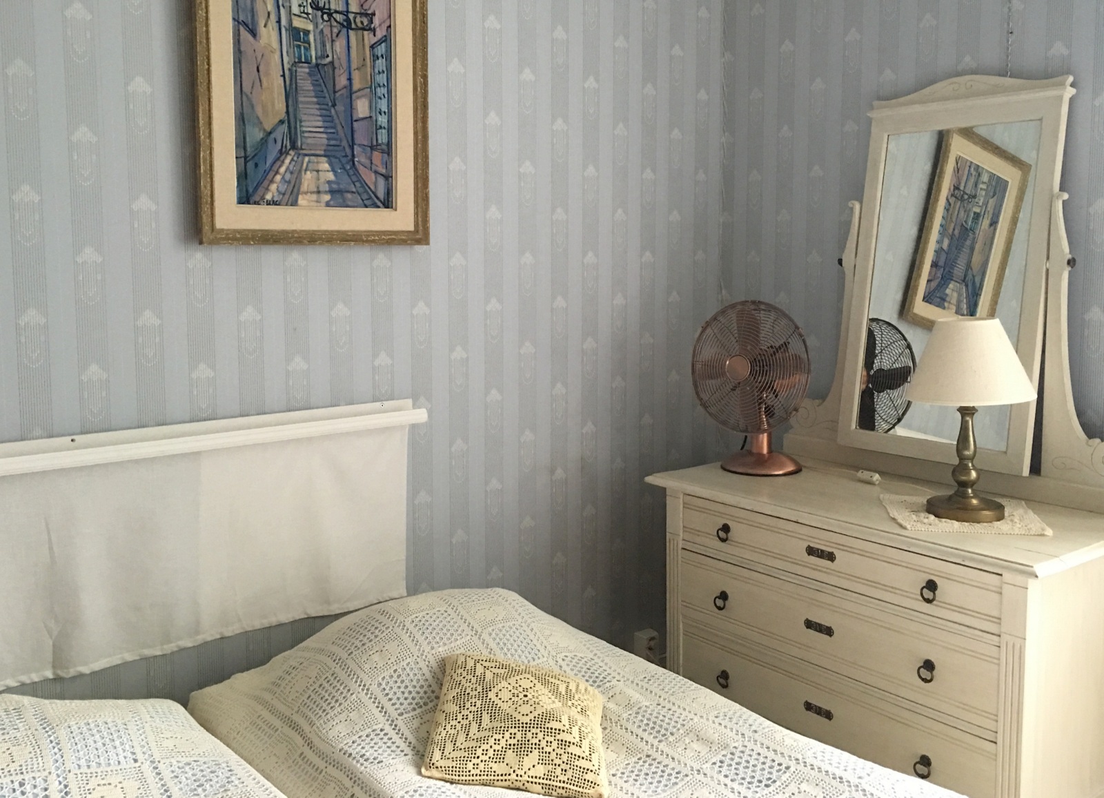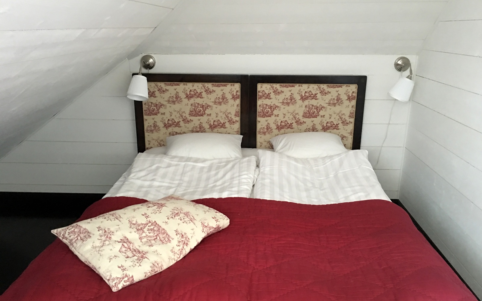 Mutta historia sikseen, vaikka se täällä haviseekin. Huoneemme on alakerrassa ja siinä on kaikki tarpeellinen, myös pieni parvi, jota emme tarvitse, kun ei satu olemaan sopivan ikäisiä lapsia matkassa. Kylpyhuonekin on pieni, mutta kuka sitä nyt oikeasti isoa tarvitsee. Vanhassa talossa kaikki huoneet ovat erilaisia, myös kooltaan, mutta tämä on hyvä, kahdelle hengelle. Yläkerrassa on isompiakin, isommille porukoille.