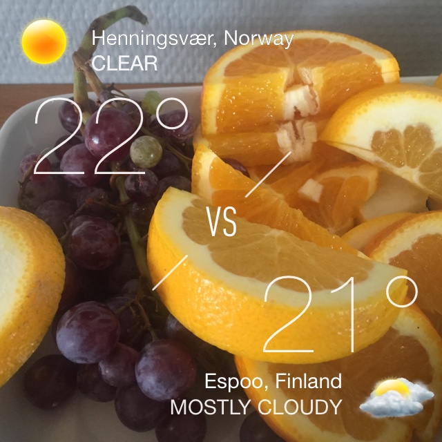 Sääkuvat on tehty iPhonen Instaweather Pro -sovelluksella, josta voisi vielä mainita, että kuva on otettava oikeana päivänä, sitä ei voi valita olemassaolevien kauniin aurinkoisten kuvien joukosta!