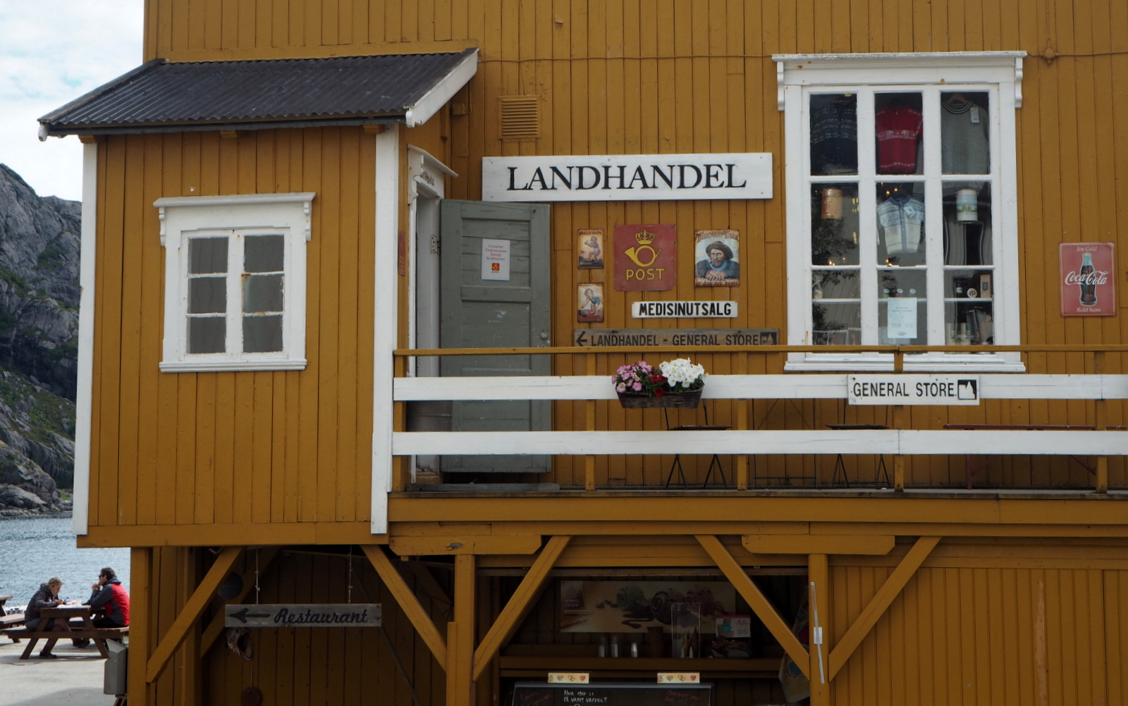 Nusfjord mainostaa itseään mm. vanhalla kaupalla. Nusfjord oli ensimmäinen kohdallemme osunut kylä, jossa oli pieni pääsymaksu koko kylään. Ensin ajatus tuntui vähän vieraalta, siis jos vaikka vaan haluaisimme poiketa kaupassa tai ravintolassa, niin siitä pitäisi maksaa pääsymaksu, mutta maksu oli pieni ja sillä pääsi sitten myös kylän museoihin. Pieni lintukallio, jossa asuu satoja lokkeja, oli sekin mielenkiintoisen näköinen, kuten kymmenet talojen seinustoilla pesivät lokit.