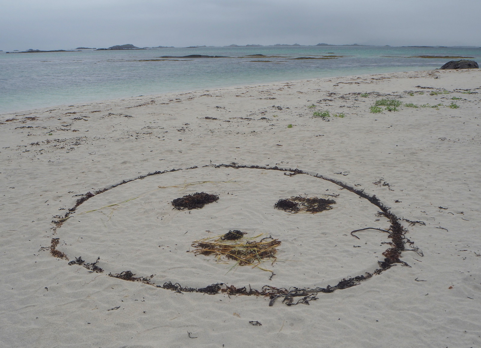 Eggumin pieni majakka oli hyvin samantapainen kuin Laukvikin. Majakka ja näkymät olivat kauniit ja hiekkarannalle oli joku iloksemme askarrellut hymynaamankin!