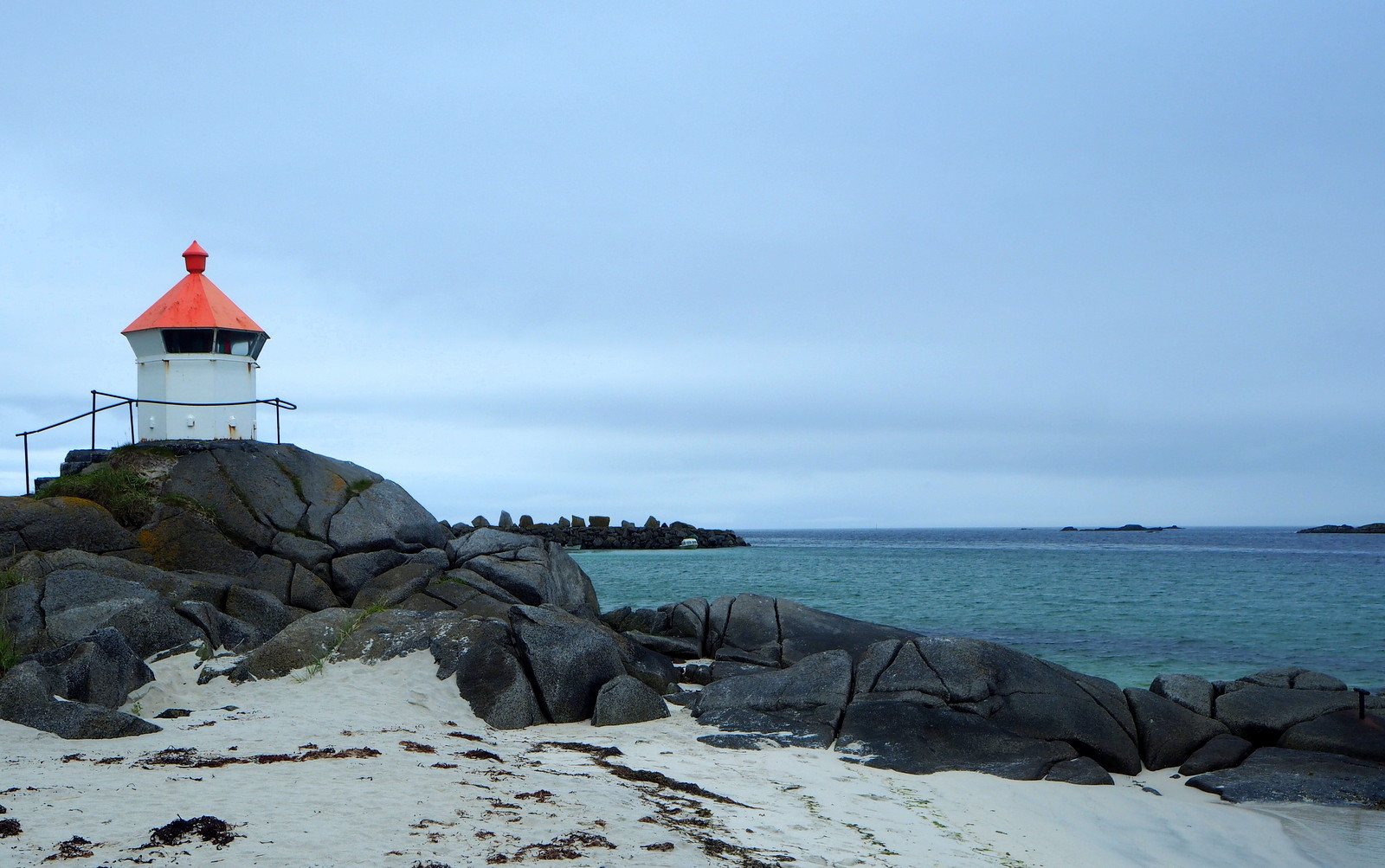 Kabelvågin majakalle saimme pujotella pienen kylän kiemurtelevien teiden läpi, mutta löytyihän se sieltä, hiukan sumuisena päivänäkin, kylän satamasta, aallonmurtajan päästä.