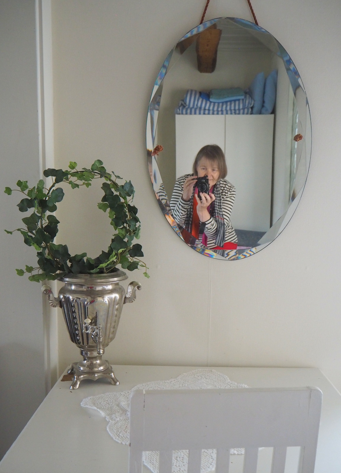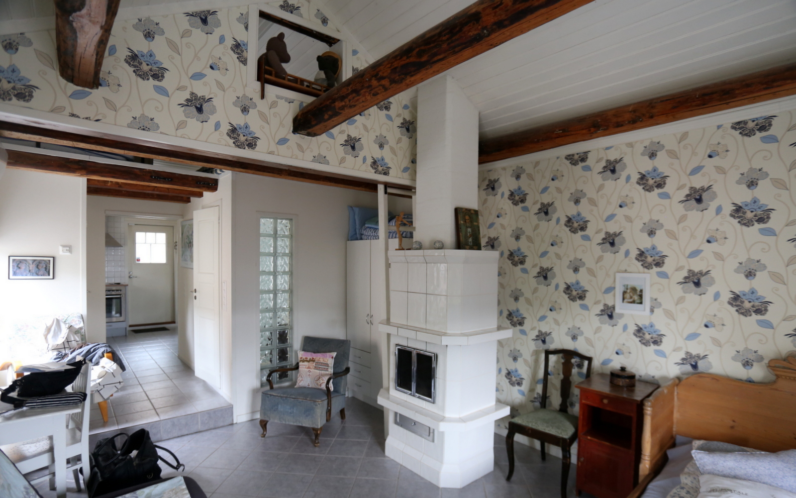 Talojen sisustus on toteutettu vanhaan miljööseen sopivassa hengessä, pieniä yksityiskohtia myöten. Ihastelin jo ensi käynnillämme kesäkuussa Pikku-Lintulan tapetteja, sänkyä, päiväpeittoa ja parvella istuvaa nallepariskuntaa ja kun sitten oikeasti elokuussa yövyimme täällä, niin sinikellokukalliset lakanat vetivät suupielet vielä enemmän hymyyn. Jotenkin vaan kaikki oli niin kohdallaan. Tällainen sänky tai tällaiset lakanat eivät ”kuulu” kaupunkikotiimme, mutta täällä kaikki oli juuri sellaista kuin pitikin!