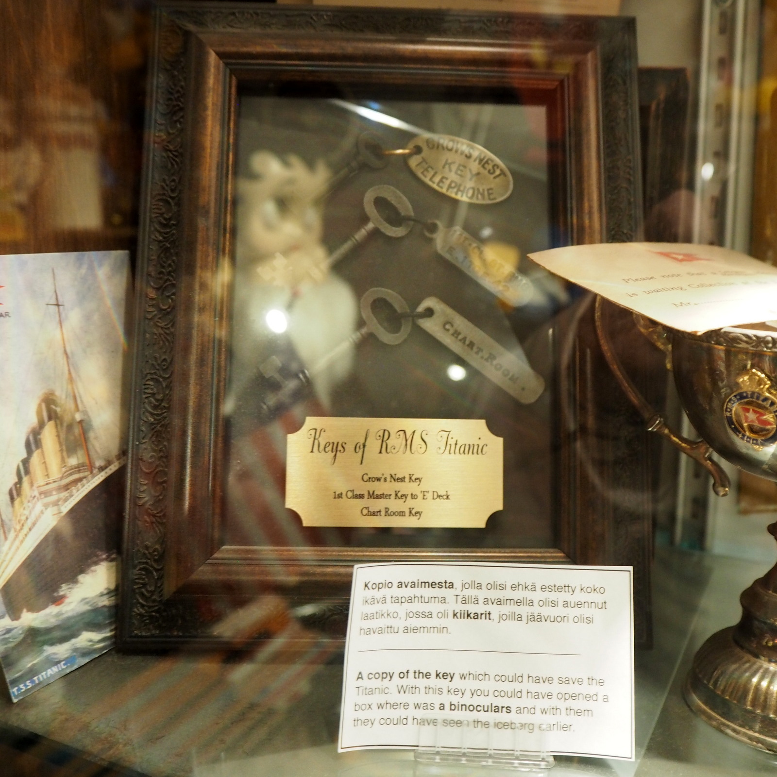 Vanhassa kaupungissa ehdimme kahdestaan kiertelemään lauantaina ja sunnuntaina sen verran, että tulimme poikenneeksi matkablogimaailmasta poimitun vinkin perusteella katsomassa Wanha Naantali –kaupan pienen pientä Titanic –näyttelyä: ajatus kutkutti, sillä olemmehan kohta lähdössä Kanadaan ja siellä Halifaxiin, jonka hautausmaalle on haudattu paljon Titanicin uhreja.