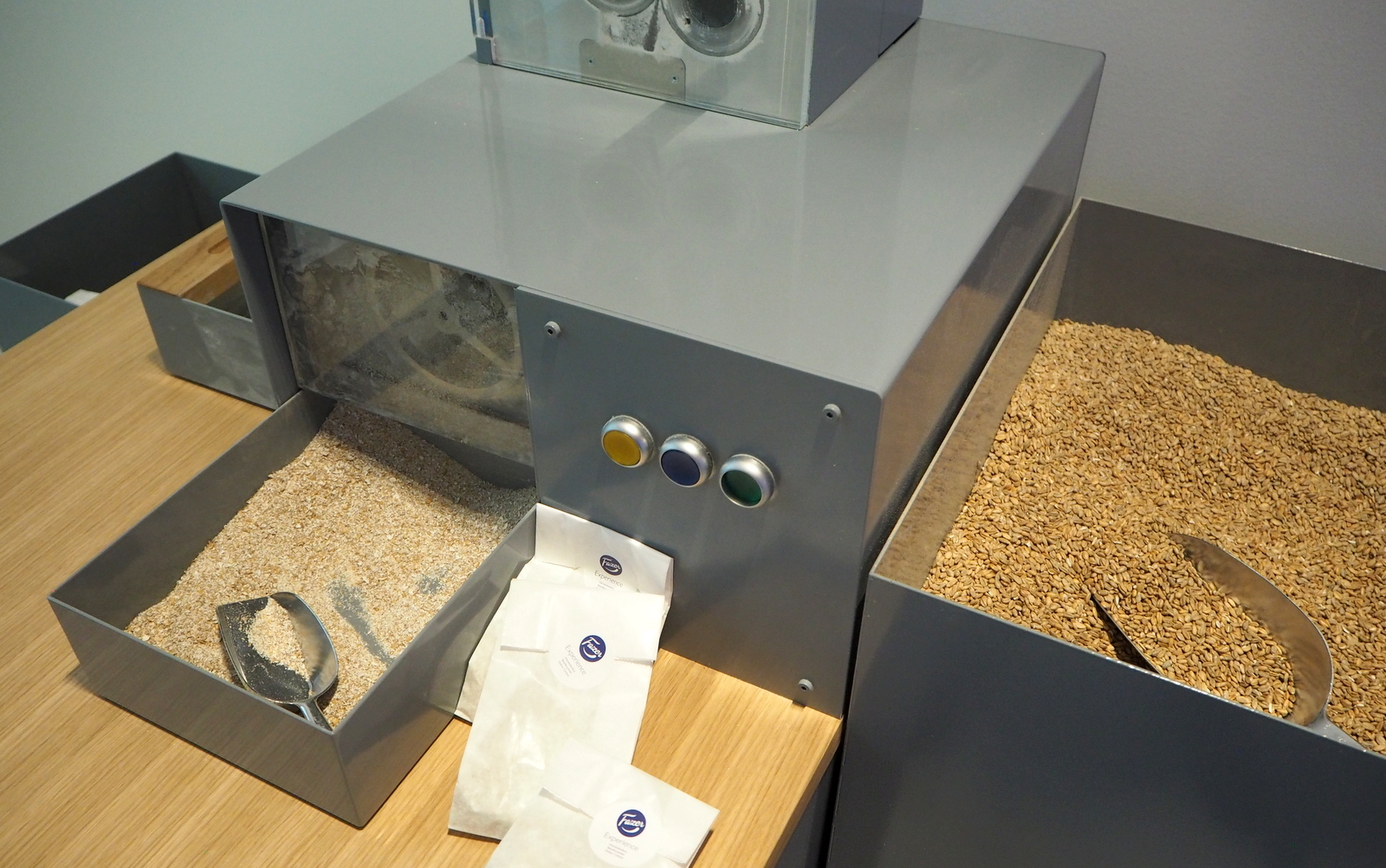 Raaka-aineita on esillä myös näyttelytilassa isoissa sammioissa ja viljan osalta pienellä “myllyllä” pääsee näkemään miten jyvistä syntyy jauhoa.