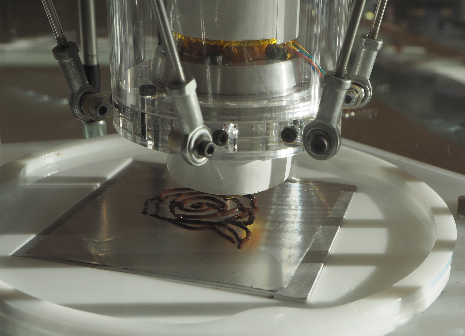 Uusinta tekniikkaa on esillä myös 3D-tulostimen muodossa vaikka suklaan tulostaminen minkä muotoisena tahansa ei ihan vielä ulotu jokapäiväiseen kuluttajatuotantoon.
