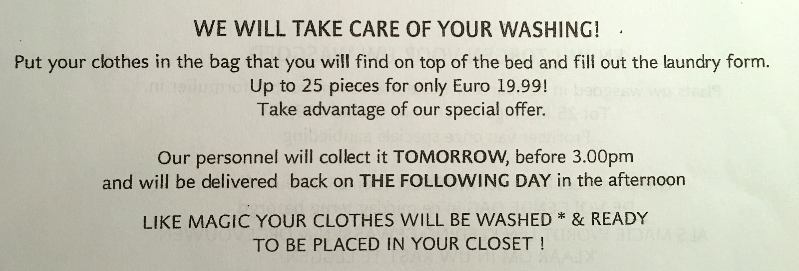 Lähes koko risteilyn ajan voimassa ollut “Magic bag” -tarjous, eli 25 vaatetta pesuun hintaan 19,99 euroa, johti myös lempivaatteiden pesettämiseen jo matkan puolessa välissä, joten ei niitä muita, varalle otettuja, tosiaan olisi tarvinnut. Mutta toisaalta, eipä niitä vähän turhan paljon kaikkea sisältäneitä matkalaukkuja joutunut risteilyllä roudaamaan missään vaiheessa.