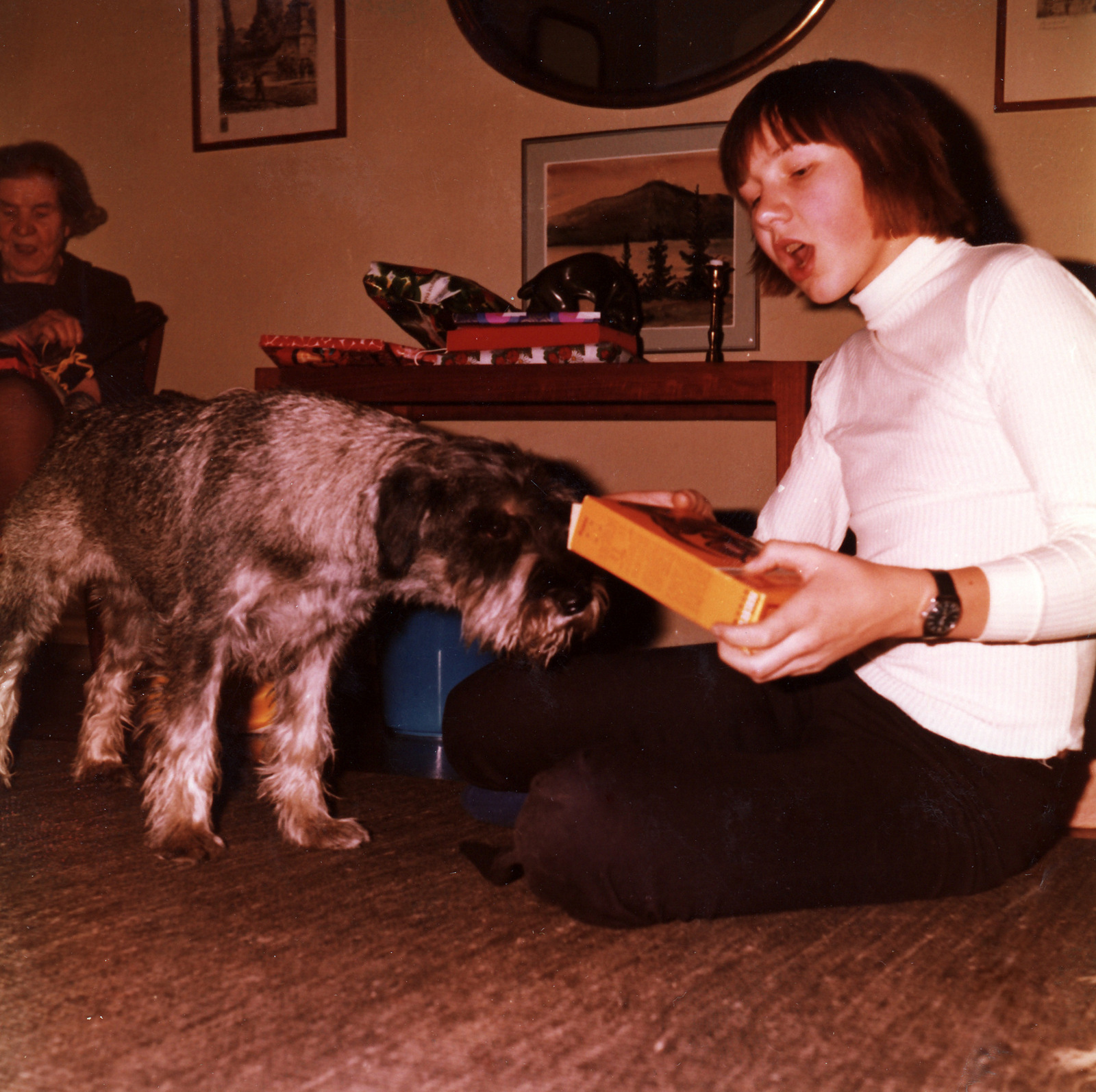 (Kuvissa yllä minä joululahjayöpaidassani, koiramme Vili, veljeni avaamassa lahjaansa ja äitini jouluiltana.)