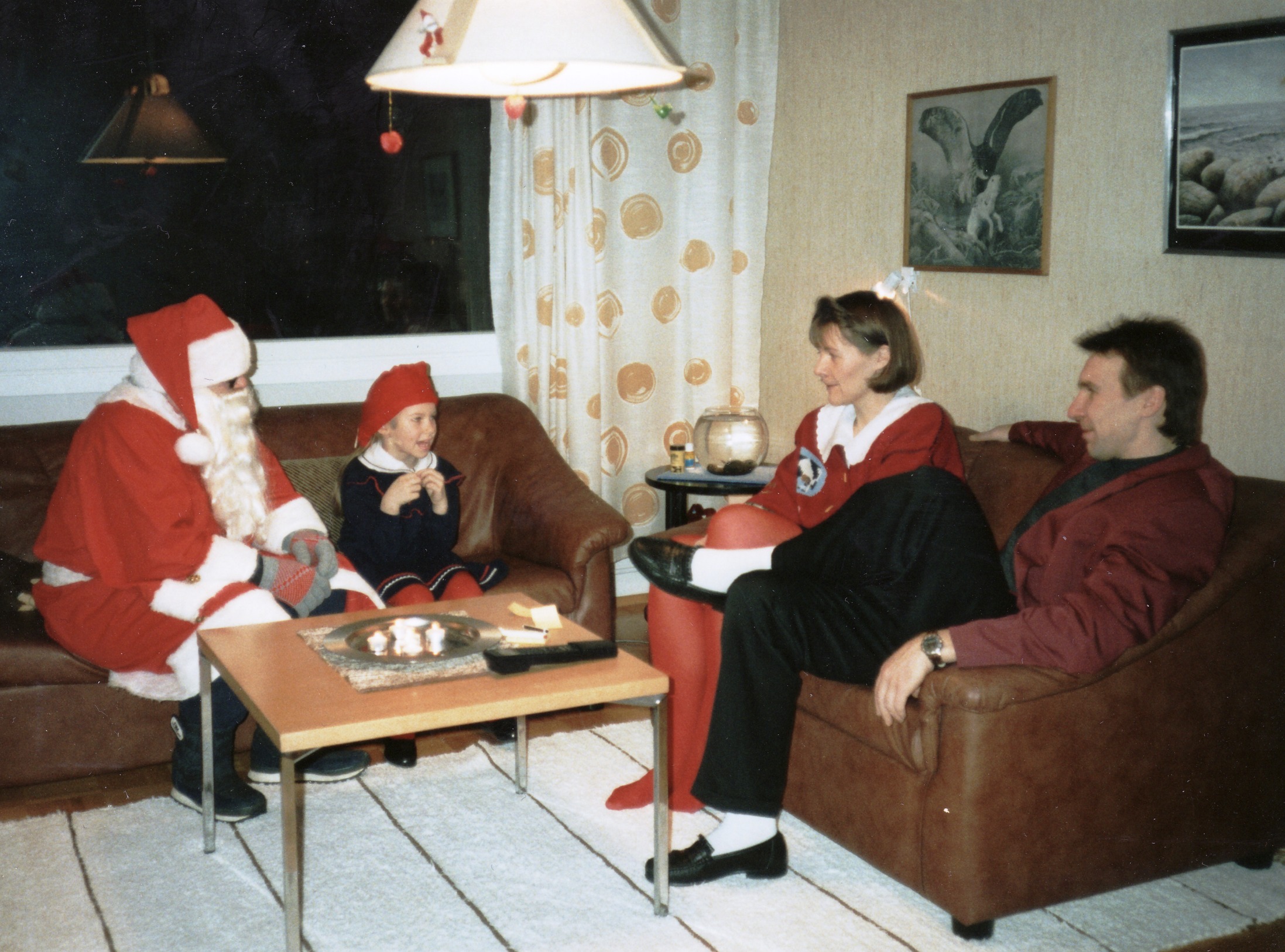 Jouluaaton ohjelma noudatti useimmiten samaa kaavaa: isä kävi aamupäivällä lenkillä ja saunassa ja sen jälkeen koko perhe kokoontui isoon ruokasaliin jouluaterialle: vanhempani, sisareni ja veljeni ja useimmiten myös Helsingissä asuva fammu, farmor. Lapset odottivat ateriaa kärsimättömästi, ei tietenkään ruuan takia vaan aterian jälkeen tapahtuvan lahjojen jaon takia. En muista, että meillä olisi koskaan ollut joulupukkia: joku meistä lapsista vaan jakoi lahjat isosta pärepyykkikorista ja kuusen alta.