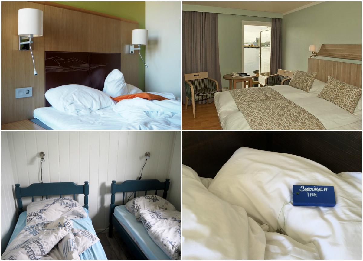 Kuvassa alla hotellisänkyjä Bodön Radisson Blusta, Scandic Svolvaerista, Hagstuan loma-asunnosta ja Sörvågen Innistä. Radisson Blu oli taattua laatua, etenkin aamupalalla, Scandic Lamholmenilla oli loistavasta sijainnista huolimatta hotellina aika tylsä. Hagstuan mökin kanssa meillä oli ongelmia alusta loppuun: jouduimme odottamaan melkein tunnin avainta ja lopuksi Lasse löi päänsä väärällä korkeudella/väärässä kohdassa olevaan keittiönkaapin kulmaan niin, että yksi valkoinen pyyhe siinä värjäytyi punaiseksi ennen kuin verenvuoto tyrehtyi. Onneksi jäi kuitenkin pintahaavaksi. Sörvågen Innin paras puoli oli aamulla kilometrin matka Moskenes – Bodö -lautalle.