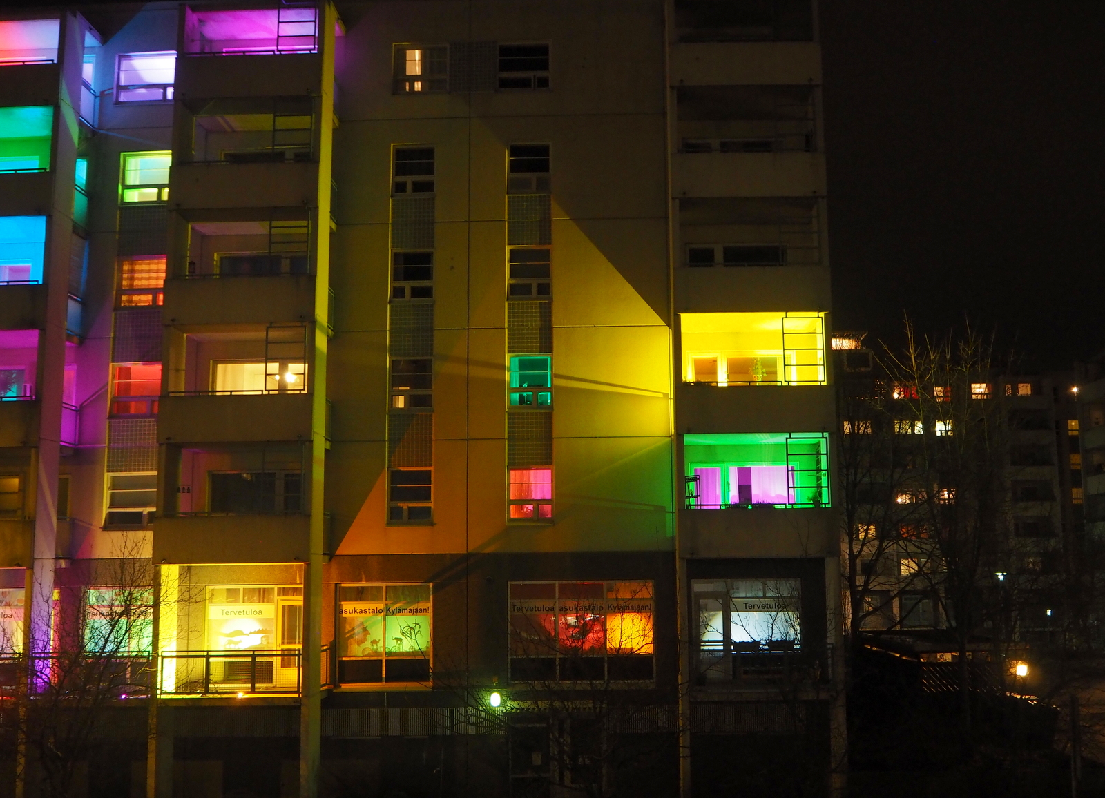 Espoossakin oli helmikuussa pieni oma “LUX Espoo” -tapahtumansa. Matinkylän Kylämajan talo valaistiin yhtenä iltana näyttävästi ja vaikka pakkanen tuolloin illaksi vähän kiristyikin, niin talsimme sitä katsomaan. Sen kerran kun kävelyetäisyydellä on jotain näinkin yllättävää! Yhden illan ja yhden kohteen tapahtuma keräsi myös vain kohtuullisen yleisön – ei ruuhkia täällä meillä päin :-)