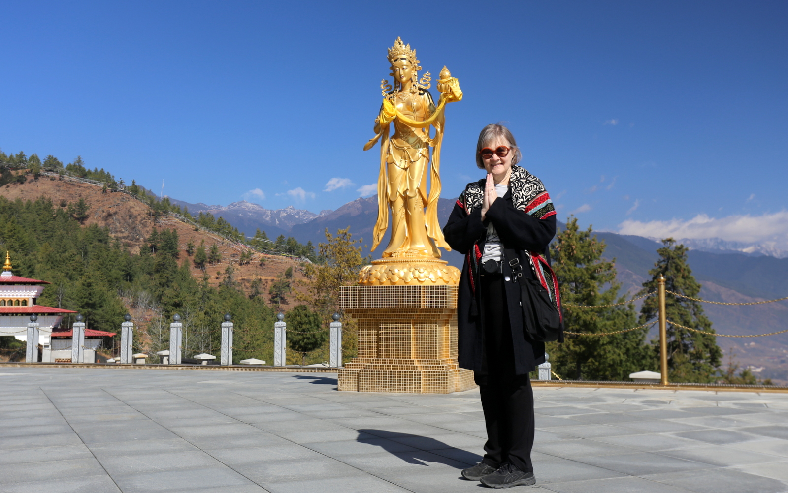 Kunnon kaupunkikierrokset alkavat näköalapaikalta. Niin myös Bhutanin pääkaupungissa Thimphussa. Pieni bussimme kiipeää sitkeästi rinnettä ylöspäin ja saavulle maailman suurimman Buddha-patsaan juurelle. Hiukan alempaa patsaalle johtavat portaat eivät vielä ole valmiit, mutta yli 2600 metrin korkeudessa vaihtoehto bussilla ylös on oikein hyvä!