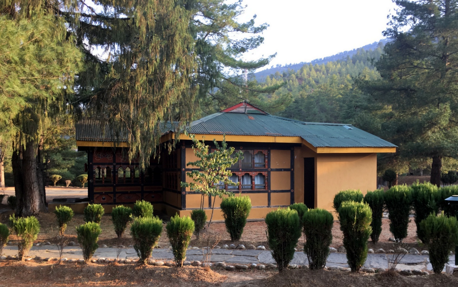 Parossa asuimme historiallisessa Olathang-hotellissa, joka rakennettiin vuonna 1972, kuulemma maan ensimmäisenä hotellina, vanhan kuninkaan kruunajaisiin osallistuneita valtiovieraita varten. En tiedä rakennettiinko nämä erilliset pienet talotkin, jossa meidän huoneemme sattuu sijaitsemaan jo silloin, mutta päärakennus ainakin. Hotellihuone odotti meitä lämpimänä ja kuumaa vettä sai alle minuutissa. Huoneen lämpöpatteri ei kuitenkaan täälläkään lämmitä kylpyhuonetta.