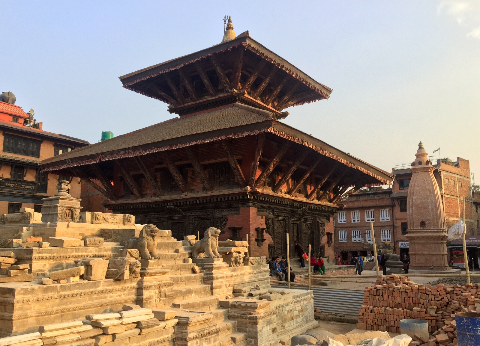 Läheisellä Taumadhin aukiolla 5-kerroksinen Nyatapolan temppeli, Nepalin suurin ja korkein pagoda, sen sijaan säilyi melko lailla vahingoittumana.