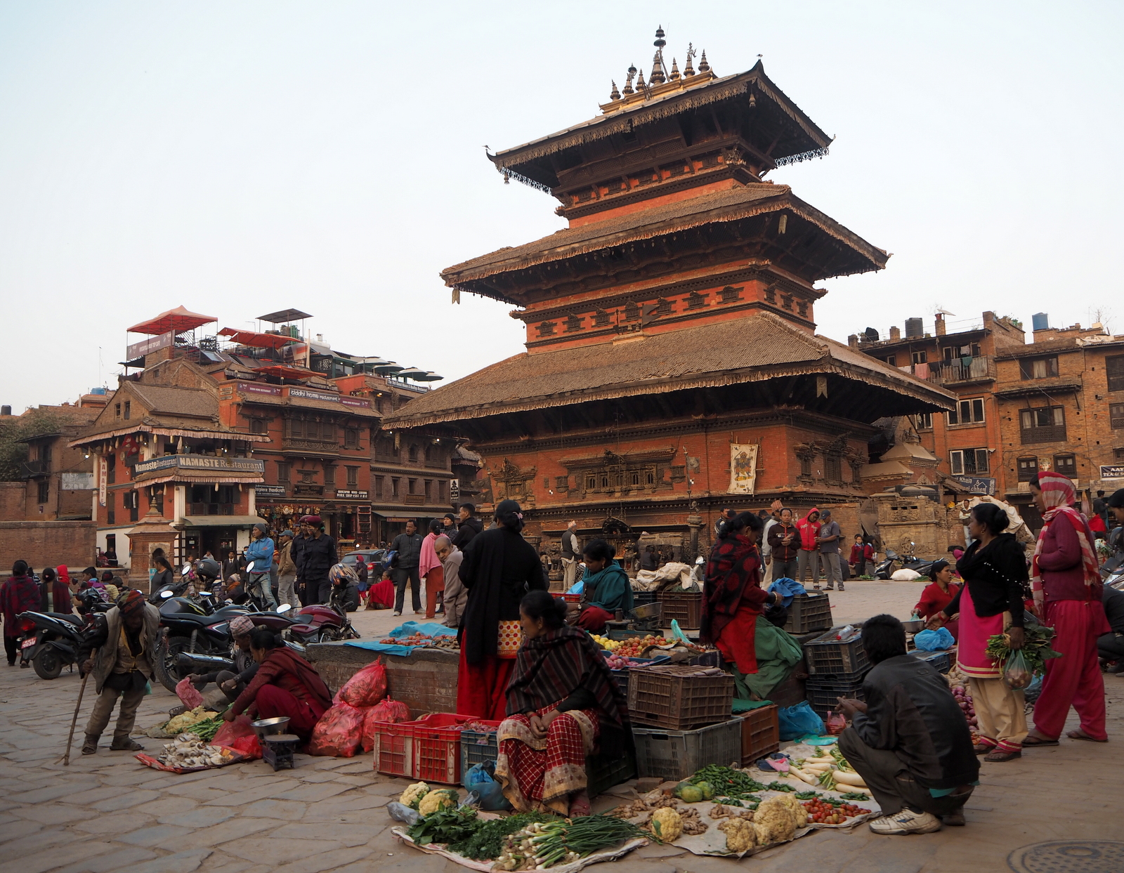 Illan jo hämärtyessä torilla myytiin vihanneksia ja hedelmiä ja kaupunki tuntui tältäkin osin enemmän ihmisten kodilta kuin matkamuistomyymälöiden reunustamat stupat Kathmandussa tai Patanin historiallinen keskusta.