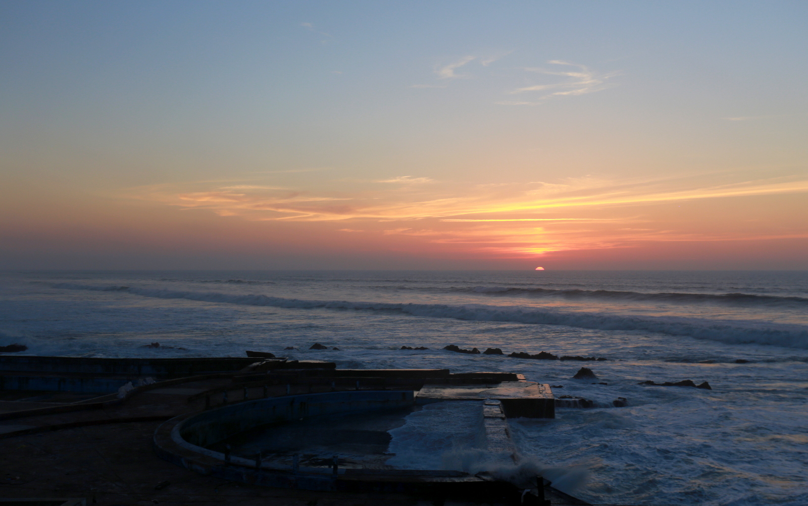 Lisäretkipakettiin kuuluu Casablancaan saapuessamme myös Casablanca by night -kierros ja opas kysyi meiltä retkelle lähtijöiltä (noin puolet ryhmästä), että haluaisimmeko lähteä sen verran aikaisin, että ehtisimme katsomaan auringonlaskua! Tietysti halusimme ja ensimmäinen Casablancasta mieleemme piirtyvä maisema olikin sitten auringonlasku Atlantin aaltoihin. Kierreltyämme sisämaassa muutaman päivän jo pelkästään tämän näkymän takia olisi voinut tulla Casablancaan. Takanamme aukeava The Corniche -rantabulevardi oli tässä vaiheessa huomattavasti vähemmän mielenkiintoinen.