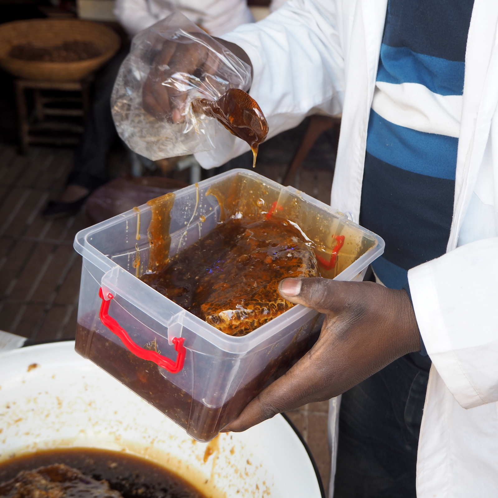 Kalatorilla rohkeimmat nauttivat tuoreista ostereista, mutta me tyydyimme kiertelemään toria muuten. Ja oli sen reunoilla muutakin kuin kalaa – esimerkiksi hunajaa, johon liittyen myytiin myös kennoja. Enpä ole ennen tätä onnistunut näkemään.