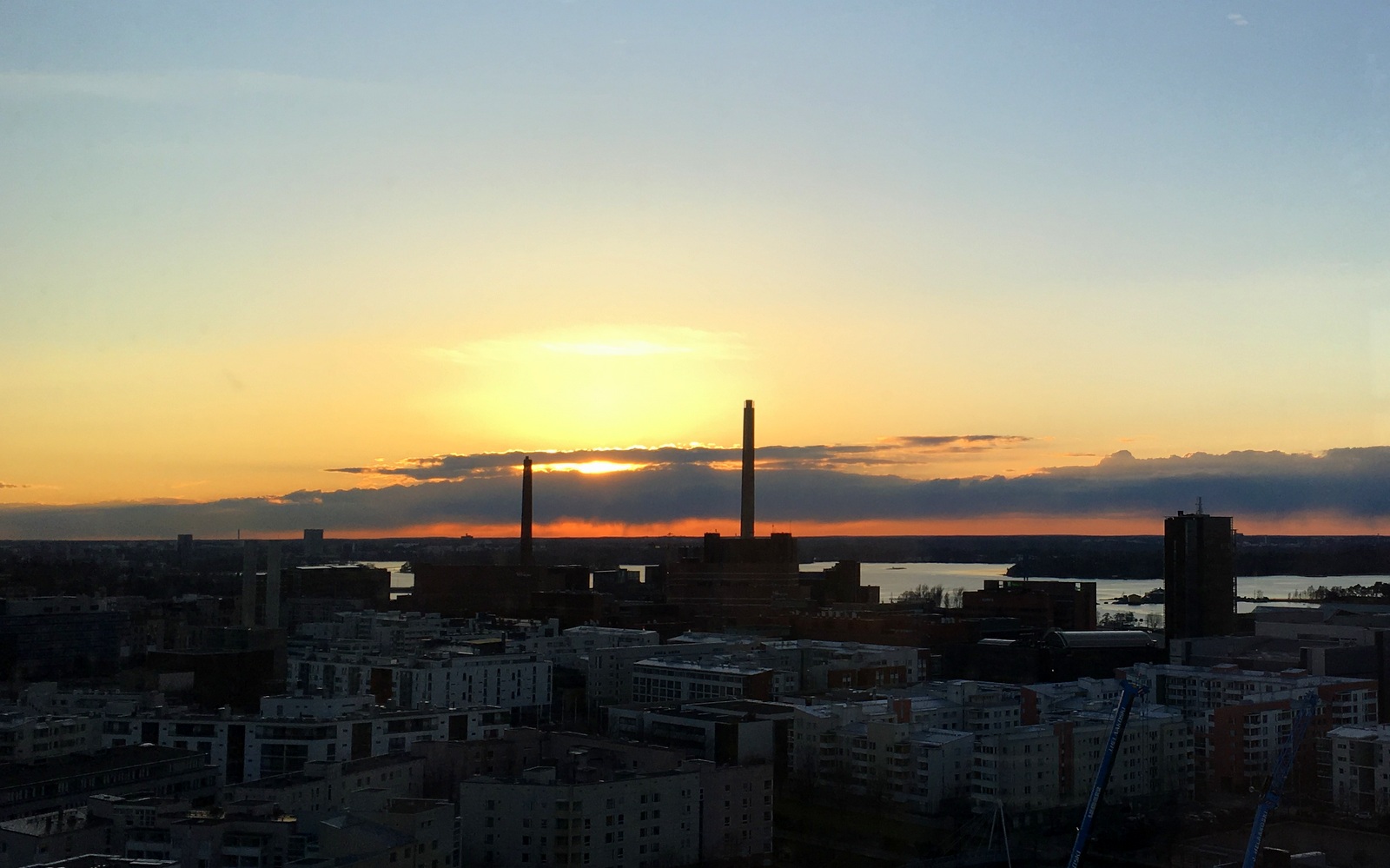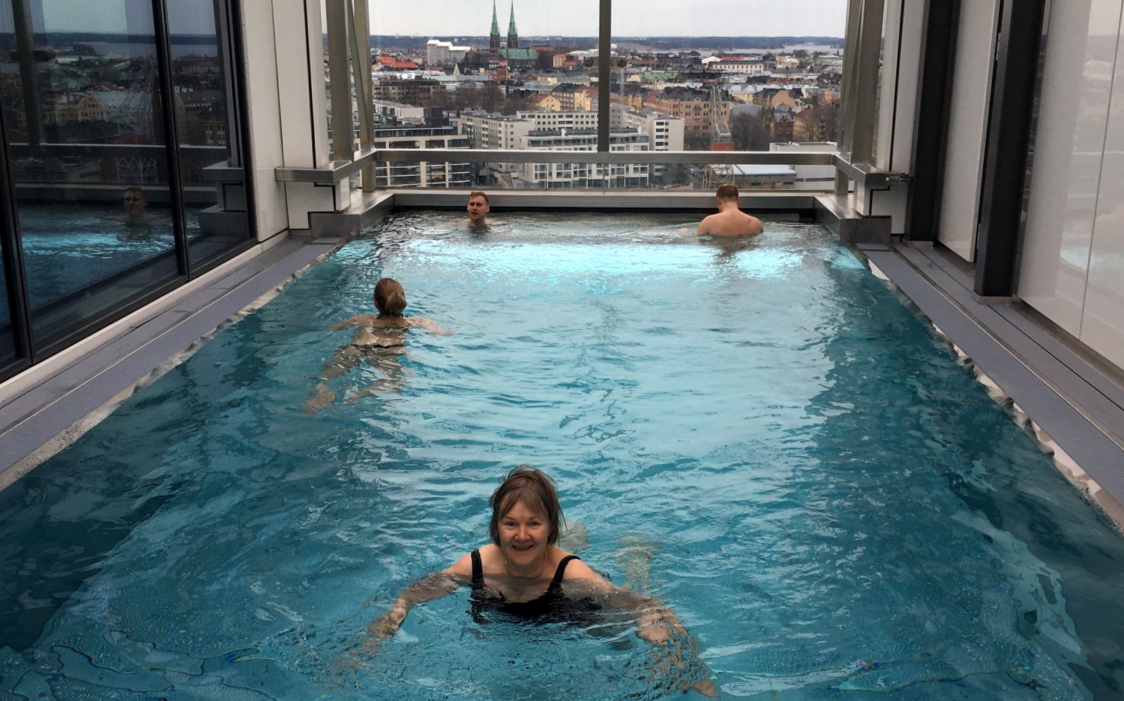 Jäimme kuitenkin, Lassekin, yöksi Clarion-hotelliin, edullisen Ping-hinnan houkuttelemana. Pitihän sitä päästä kuvaamaan auringonlasku 16. kerroksen Sky Loungesta ja testaamaan katolla sijaitseva uima-allas, vaikka vapun aaton aattona siellä olikin vielä melko viileää!