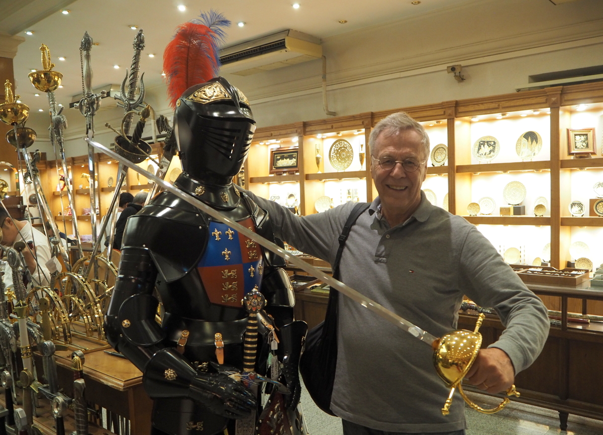 Kaupunki on myös, kuulemma, tunnettu veitsistä, miekoista ja kilvistä – ja damasquino-tekniikasta. Damasquino tarkoittaa, että esimerkiksi koru kaiverretaan teräksestä, mutta sitten koristellaan kullalla ja hopealla. Ryhmäretkellä kun olimme, vietimme myös hetken tällaisessa työpajassa, pitihän ryhmällä jossain olla mahdollisuus käydä vessassa ennen paluuta Madridiin! Veitsiä tai miekkoja ei kyllä tarttunut matkaan.