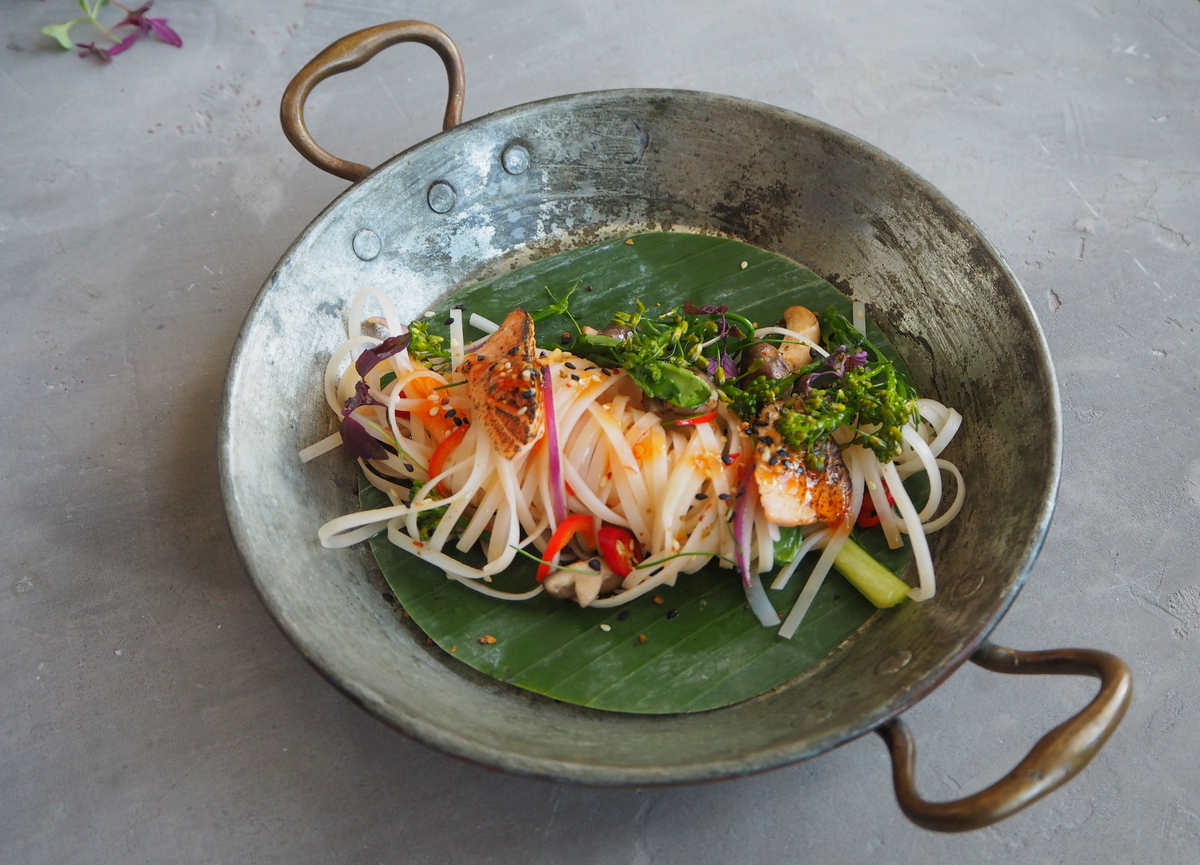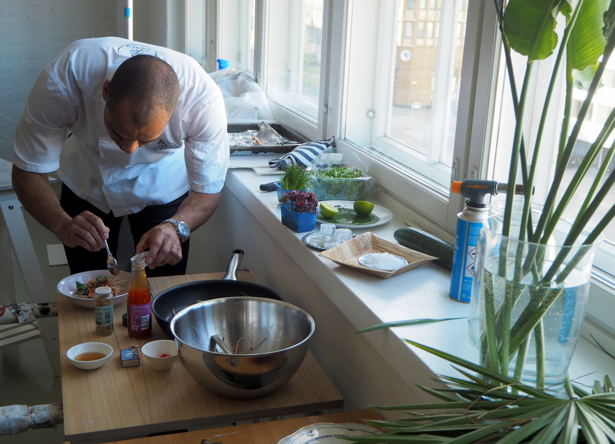 Santa Marian tilaisuudesta maistiaisena Alex Nurmi valmistelemassa kuvattavaa annosta ja valmis aasialainen streetfood -annos, tässä ihan amatöörin, eli Pirkon kuvaamana. Valokuvaaja Kristiina Hemmingin kuvat samasta annoksesta näyttivät kuitenkin vielä vähän erilaiselta. Mutta näkyy tuostakin kuvasta, jos tarkasti katsoo, niin kastike kuin seesaminsiemenetkin!