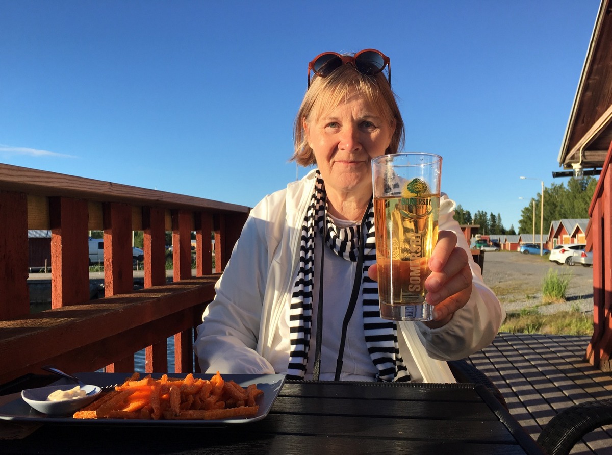 Luontoretken jälkeen palkitsimme itsemme ilta-auringossa Salteriet -ravintolan terassilla siiderillä ja bataattiranskalaisilla – ei hassumpi päivä.