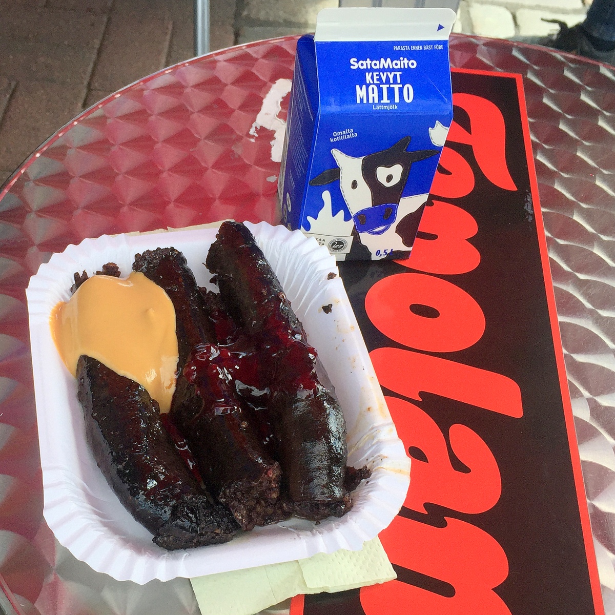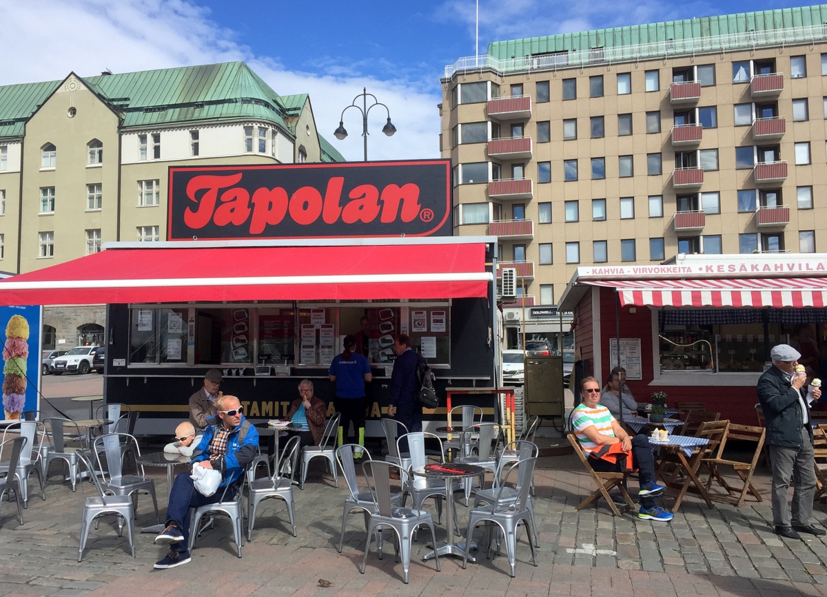 Lounasristeily lähti Laukontorilta ja saavuimme rantaan sen verran ajoissa, että ehdimme näkemään Tapolan kioskin torilla ja muutamia annoksia mustaa makkaraakin. Onneksi olimme menossa lounaalle, joten ei ollut kiusausta maistaa tätä paikallista herkkua …