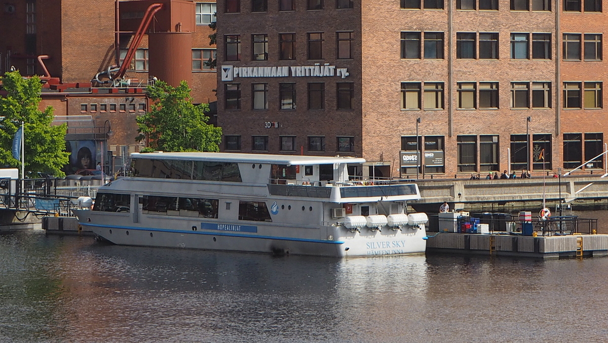 Hopealinjan Silver Sky -alus oli “turistilaivaksi” moitteettoman siisti. Olemme muutamissa vastaavissa laivoissa vierailleet niin Suomessa kuin maailmallakin ja lähes turtuneet ajatukseen, että tällaisten laivojen kuuluu olla hiukan nuhruisia ja epäsiistejä, mutta ei Tampereella, selvästikään. Toki alus on lähes uusi (vuodelta 2014), mutta silti!