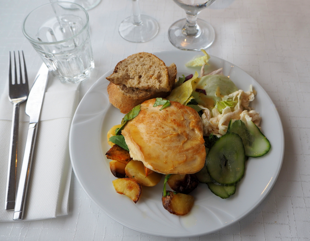 Maisemien ohella nautimme myös lounaasta, joka osoittautui miellyttävän tavalliseksi. Tarjolla oli salaatteja, graavattua lohta, tillisilakkaa ja härkäpastramia alkuruokapöydässä ja kanaa ja bataattikuutioita pääruuaksi. Turhan usein merellisyyttä kaipaavilla risteilyillä on tarjolla vain kalapöytää ja lohikeittoa. Lounaan jälkeen tarjolla oli vielä kahvia tai teetä ja täytekeksejä :-)