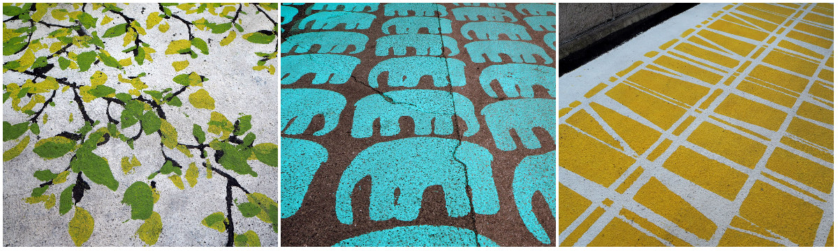 Tallustelimme myös useamman Finlaysonin katuun maalatun kuosin päällä, joista etenkin ne, jotka löytyvät liinavaatekaapistammekin saivat hymyilemään: tässä on Elefantit -lakanamme, tässä äskettäin hankkimamme unipussien Visa-kuosi.