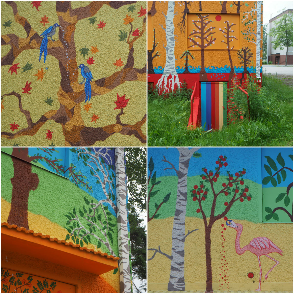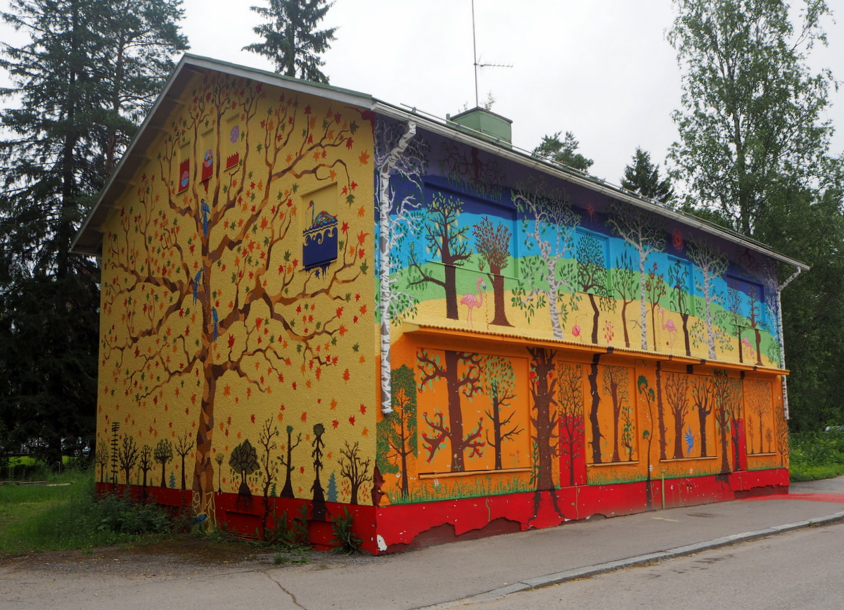 Päivän toinen kohteemme on jo edellisenä iltana Mäntän keskustassa, Kauppakadulla, näkemämme talo. Purkutalosta on tehty mänttäläisten ja taiteilijan toteutettu näyttävä yhteisöllinen taideteos.
